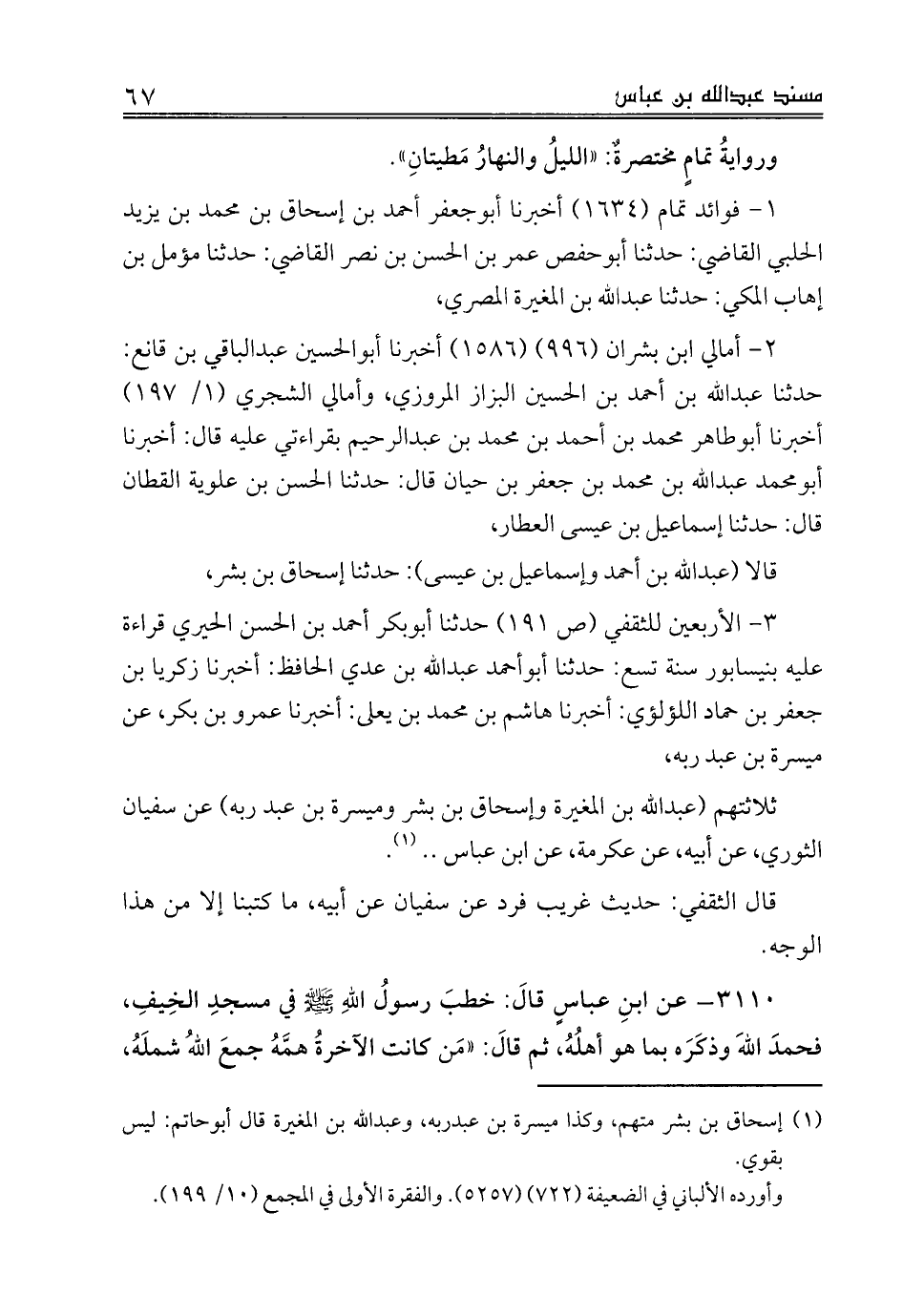 ثلاثتهم (عبدالله بن المغيرة وإسحاق بن بشر وميسرة بن عبد ربه) عن سفيان الثوري، عن أبيه، عن عكرمة، عن ابن عباس .. (¬1).