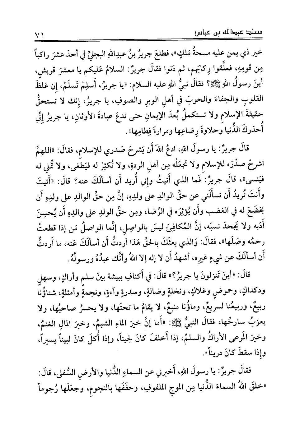 قالَ جريرٌ: يا رسولَ اللهِ، ادعُ اللهَ أَن يَشرحَ صَدري للإسلامِ، فقالَ: «اللهمَّ اشرحْ صدْرَه للإسلامِ ولا تجعَلْه مِن أهلِ الردةِ، ولا تُكثِرْ له فيَطغى، ولا تُملي له فيَنسى»، قالَ جريرٌ: فَما الذي أَتيتُ وإِني أُريد أَن أسألَكَ عنه؟ قالَ: «أَتيتَ وأَنتَ تُريدُ أَن تسأَلَني عن حقِّ الوالدِ على ولدِهِ، إنَّ مِن حقِّ الوالدِ على ولدِهِ أَن يخضَعَ له في الغضب وأَن يُؤثِرَه في الرِّضا، ومِن حقِّ الولدِ على والدِهِ أَن يُحسِنَ أَدَبه ولا يَجحدَ نسبَه، إنَّ المُكافِئَ ليسَ بالواصِلِ، إنِّما الواصلُ مَن إذا قطعتْ رحمُه وصَلَها»، فقالَ: وَالذي بعثَكَ بالحقِّ هَذا أردتُّ أَن أسألَكَ عَنه، ما أَردتُ أَن أسألَكَ عن شيءٍ غيرِه، أشهدُ أَن لا إله إلا اللهُ وأنَّك عبدُهُ ورسولُهُ.