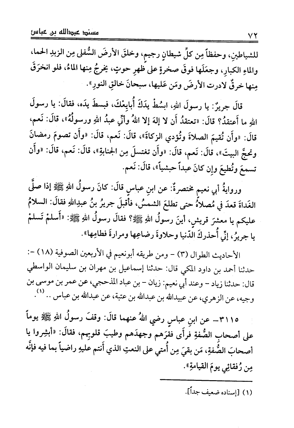 وروايةُ أبي نعيمٍ مختصرةٌ: عن ابنِ عباسٍ قالَ: كانَ رسولُ اللهِ صلى الله عليه وسلم إذا صلَّى الغَداةَ قعدَ في مُصلاهُ حتى تطلعَ الشمسُ، فأقبلَ جريرُ بنُ عبدِاللهِ فقالَ: السلامُ عليكم يا معشرَ قريشٍ، أينَ رسولُ اللهِ صلى الله عليه وسلم؟ فقالَ رسولُ اللهِ صلى الله عليه وسلم: «أَسلمْ تَسلمْ يا جريرُ، إنِّي أُحذركَ الدّنيا وحلاوةَ رضاعِها ومرارةَ فطامِها».