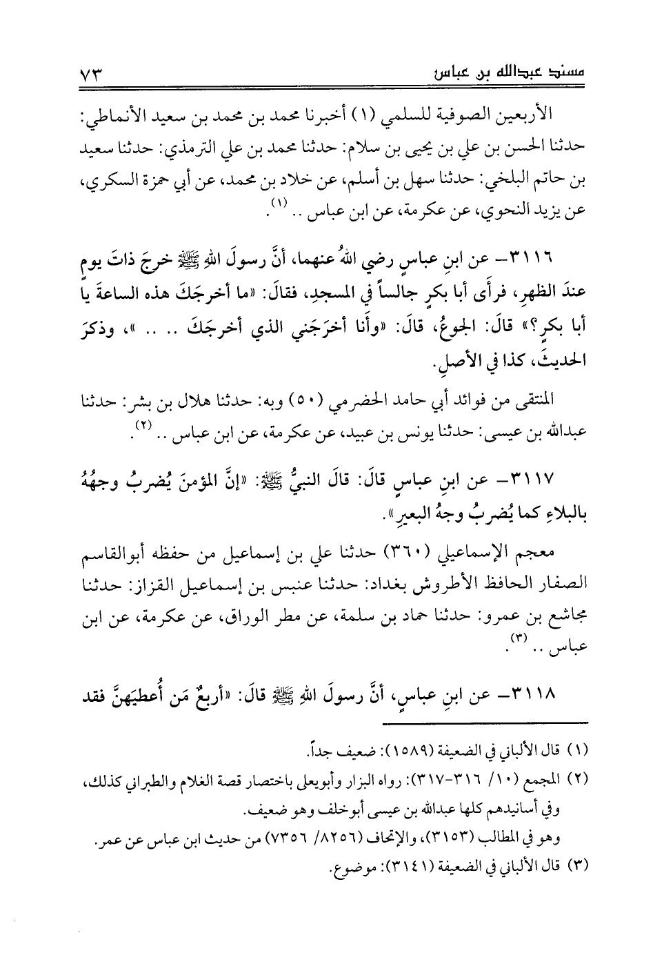الأربعين الصوفية للسلمي (1) أخبرنا محمد بن محمد بن سعيد الأنماطي: حدثنا الحسن بن علي بن يحيى بن سلام: حدثنا محمد بن علي الترمذي: حدثنا سعيد بن حاتم البلخي: حدثنا سهل بن أسلم، عن خلاد بن محمد، عن أبي حمزة السكري، عن يزيد النحوي، عن عكرمة، عن ابن عباس .. (¬1).