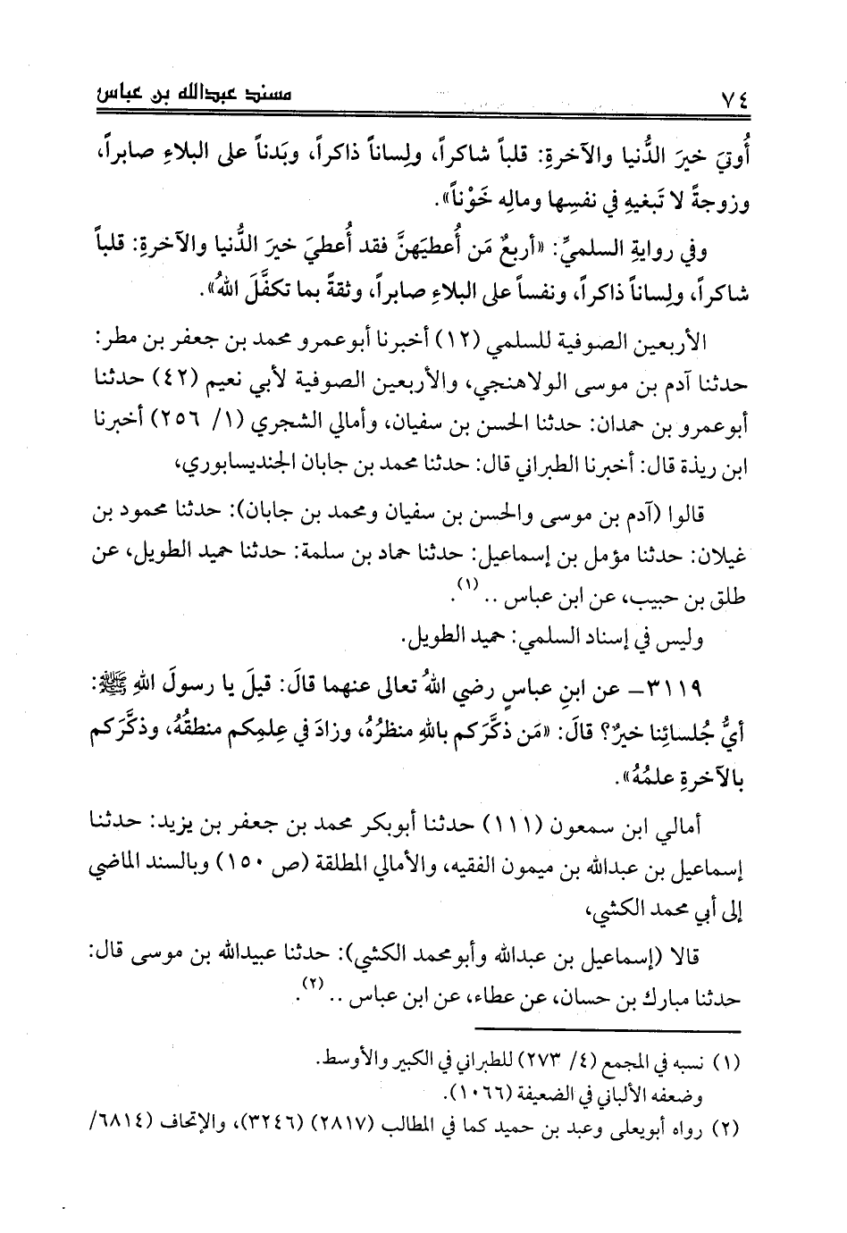 قالوا (آدم بن موسى والحسن بن سفيان ومحمد بن جابان): حدثنا محمود بن غيلان: حدثنا مؤمل بن إسماعيل: حدثنا حماد بن سلمة: حدثنا حميد الطويل، عن طلق بن حبيب، عن ابن عباس .. (¬1).