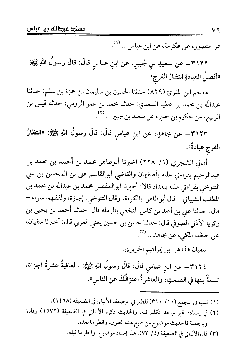 3122 - عن سعيدِ بنِ جُبيرٍ، عن ابنِ عباسٍ قالَ: قالَ رسولُ اللهِ صلى الله عليه وسلم: «أفضلُ العبادةُ انتظارُ الفرجِ».