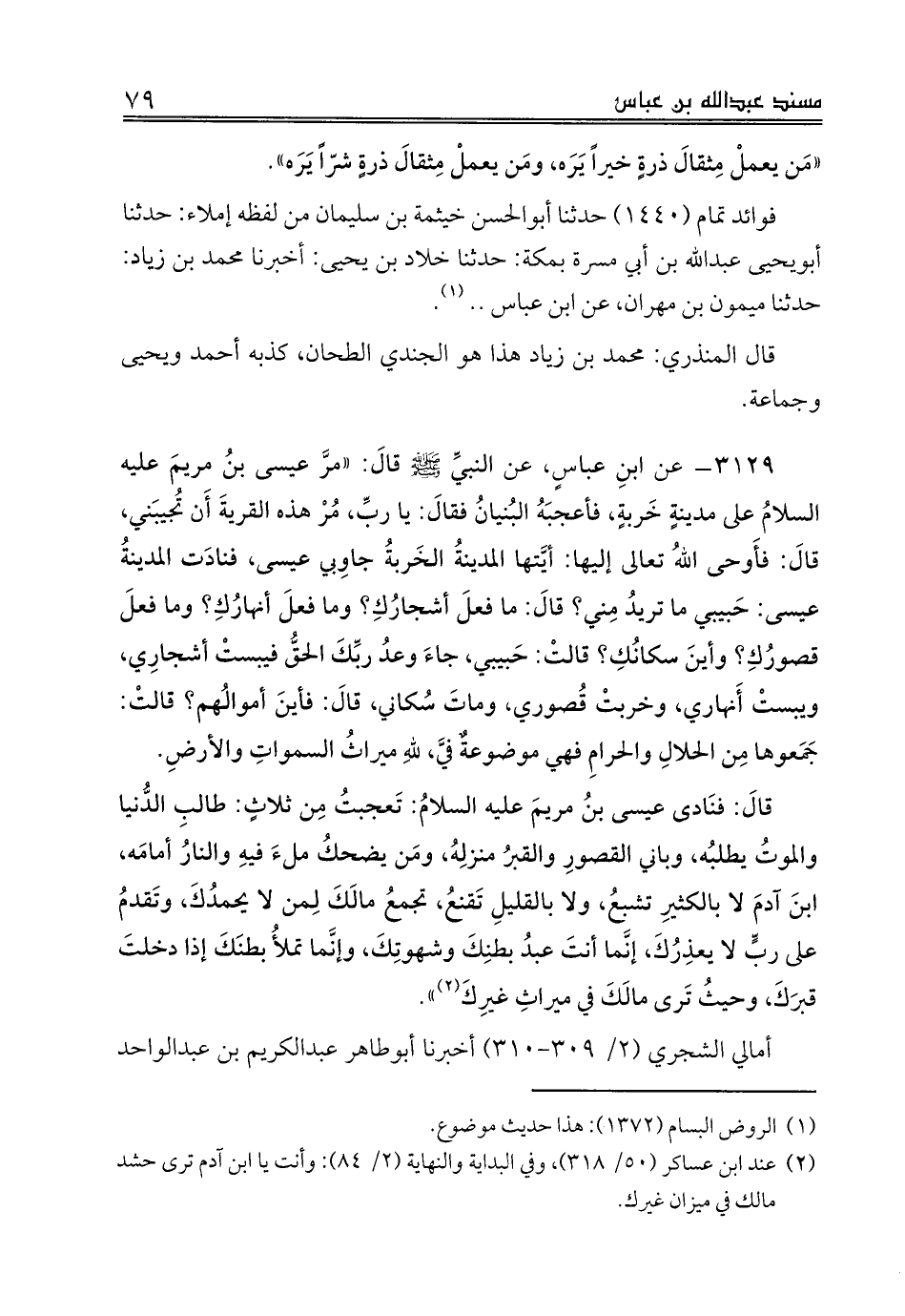 فوائد تمام (1440) حدثنا أبوالحسن خيثمة بن سليمان من لفظه إملاء: حدثنا أبويحيى عبدالله بن أبي مسرة بمكة: حدثنا خلاد بن يحيى: أخبرنا محمد بن زياد: حدثنا ميمون بن مهران، عن ابن عباس .. (¬1).