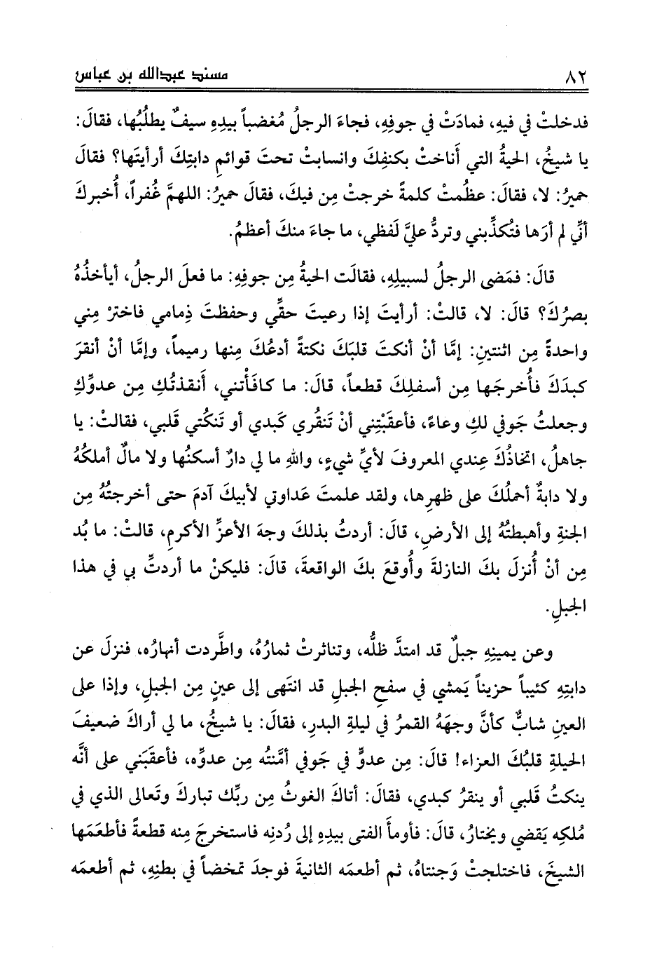 قالَ: فمَضى الرجلُ لسبيلِهِ، فقالَت الحيةُ مِن جوفِهِ: ما فعلَ الرجلُ، أيأخذُهُ بصرُكَ؟ قالَ: لا، قالتْ: أرأيتَ إذا رعيتَ حقِّي وحفظتَ ذِمامي فاخترْ مِني واحدةً مِن اثنتينِ: إمَّا أنْ أنكتَ قلبَكَ نكتةً أدعُكَ مِنها رميماً، وإمَّا أنْ أنقرَ كبدَكَ فأُخرجَها مِن أسفلِكَ قطعاً، قالَ: ما كافَأْتني، أَنقذتُكِ مِن عدوِّكِ وجعلتُ جَوفي لكِ وعاءً، فأعقَبْتِني أنْ تَنقُري كَبدي أو تَنكُتي قَلبي، فقالتْ: يا جاهلُ، اتخاذُكَ عِندي المعروفَ لأيِّ شيءٍ، واللهِ ما لي دارٌ أسكنُها ولا مالٌ أملكُهُ ولا دابةٌ أحملُكَ على ظهرِها، ولقد علمتَ عَداوتي لأبيكَ آدمَ حتى أخرجتُهُ مِن الجنةِ وأهبطتُهُ إلى الأرضِ، قالَ: أردتُ بذلكَ وجهَ الأعزِّ الأكرمِ، قالتْ: ما بُد مِن أنْ أُنزلَ بكَ النازلةَ وأُوقَع بكَ الواقعةَ، قالَ: فليكنْ ما أردتِ بي في هذا الجبلِ.