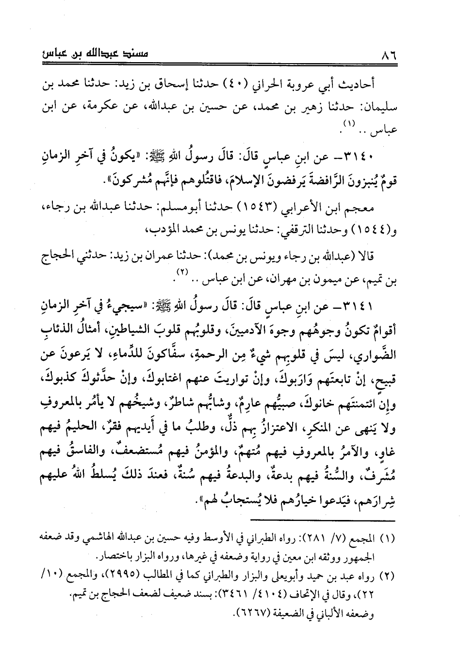3140 - عن ابنِ عباسٍ قالَ: قالَ رسولُ اللهِ صلى الله عليه وسلم: «يكونُ في آخرِ الزمانِ قومٌ يُنبزونَ الرَّافضةَ يَرفضونَ الإسلامَ، فاقتُلوهم فإنَّهم مُشركونَ».