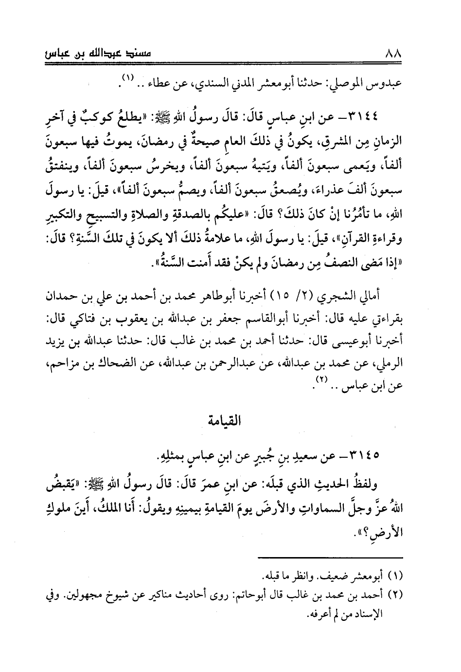 3144 - عن ابنِ عباسٍ قالَ: قالَ رسولُ اللهِ صلى الله عليه وسلم: «يطلعُ كوكبٌ في آخرِ الزمانِ مِن المشرِق، يكونُ في ذلكَ العامِ صيحةٌ في رمضانَ، يموتُ فيها سبعونَ ألفاً، ويَعمى سبعونَ ألفاً، ويَتيهُ سبعونَ ألفاً، ويخرسُ سبعونَ ألفاً، وينفتقُ سبعونَ ألفَ عذراءَ، ويُصعقُ سبعونَ ألفاً، ويصمُّ سبعونَ ألفاً»، قيلَ: يا رسولَ اللهِ، ما تأمُرُنا إنْ كانَ ذلكَ؟ قالَ: «عليكُم بالصدقةِ والصلاةِ والتسبيحِ والتكبيرِ وقراءةِ القرآنِ»، قيلَ: يا رسولَ اللهِ، ما علامةُ ذلكَ ألا يكونَ في تلكَ السَّنةِ؟ قالَ: «إذا مَضى النصفُ مِن رمضانَ ولم يكنْ فقد أَمنت السَّنةُ».