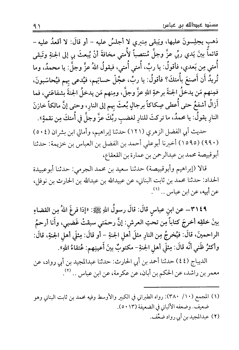 3149 - عن ابنِ عباسٍ قالَ: قالَ رسولُ اللهِ صلى الله عليه وسلم: «إذا فرغَ اللهُ مِن القضاءِ بينَ خلقِه أخرجَ كتاباً مِن تحتِ العرشِ: إنَّ رحمَتي سبقتْ غَضبي، وأَنا أرحمُ الراحمينَ، قالَ: فيُخرجُ مِن النارِ مثلَ أهلِ الجنةِ - أو قالَ: مِثلي أهلِ الجنةِ، قالَ: وأكثرُ ظَني أنَّه قالَ: مِثلي أهلِ الجنةِ- مكتوبٌ بينَ أَعينِهم: عُتقاءُ اللهِ».