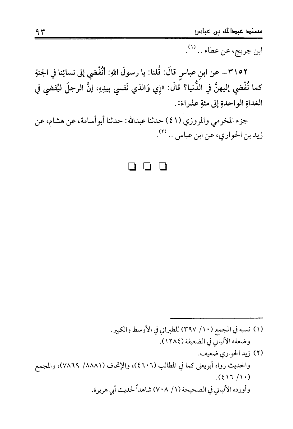 3152 - عن ابنِ عباسٍ قالَ: قُلنا: يا رسولَ اللهِ: أنُفْضي إلى نسائِنا في الجنةِ كما نُفْضي إليهنَّ في الدُّنيا؟ قالَ: «إِي وَالذي نَفسي بيدِهِ، إنَّ الرجلَ ليُفضي في الغداةِ الواحدةِ إلى مئةِ عذراءَ».