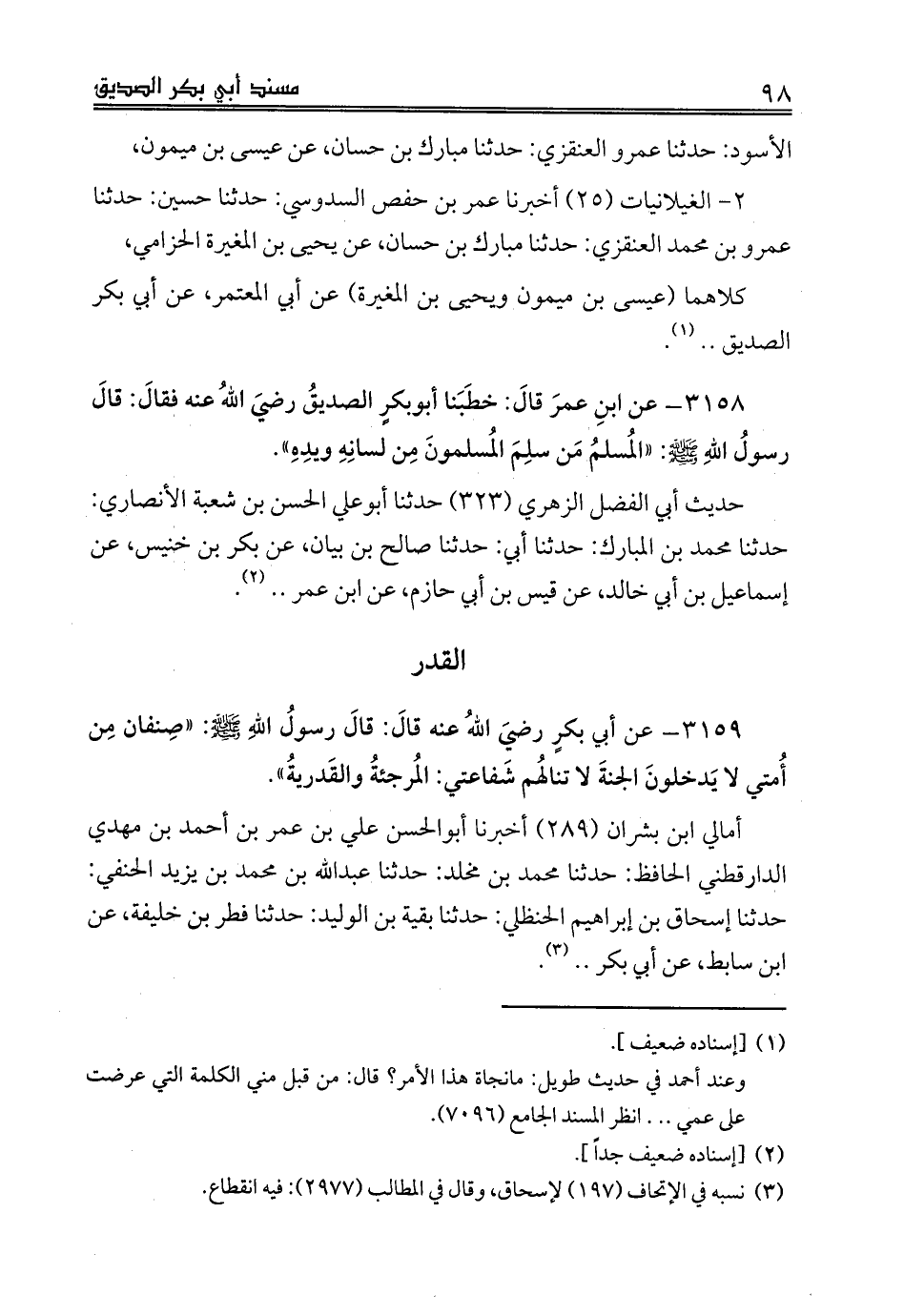 كلاهما (عيسى بن ميمون ويحيى بن المغيرة) عن أبي المعتمر، عن أبي بكر الصديق .. (¬1).