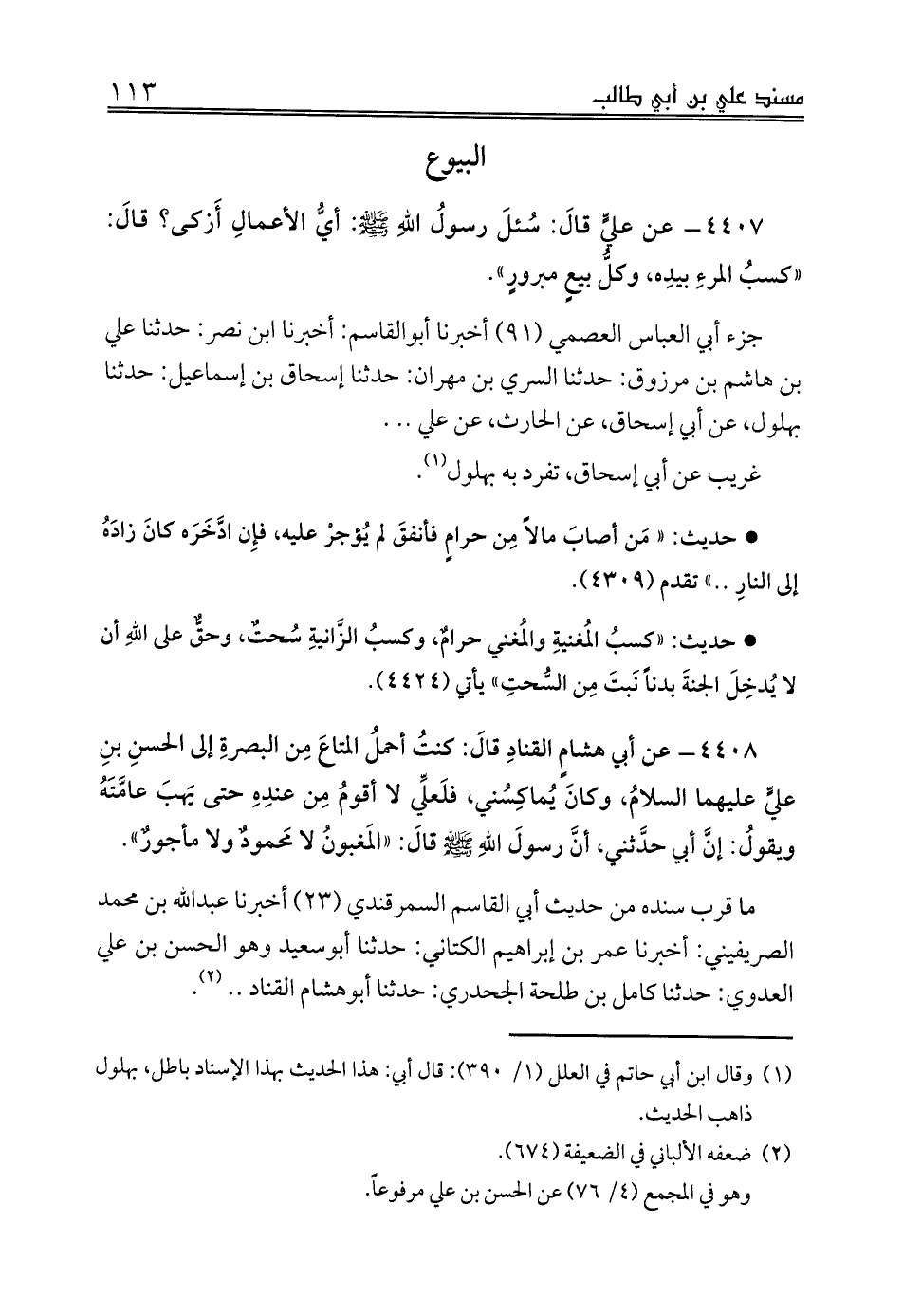 جزء أبي العباس العصمي (91) أخبرنا أبوالقاسم: أخبرنا ابن نصر: حدثنا علي بن هاشم بن مرزوق: حدثنا السري بن مهران: حدثنا إسحاق بن إسماعيل: حدثنا بهلول، عن أبي إسحاق، عن الحارث، عن علي .. .