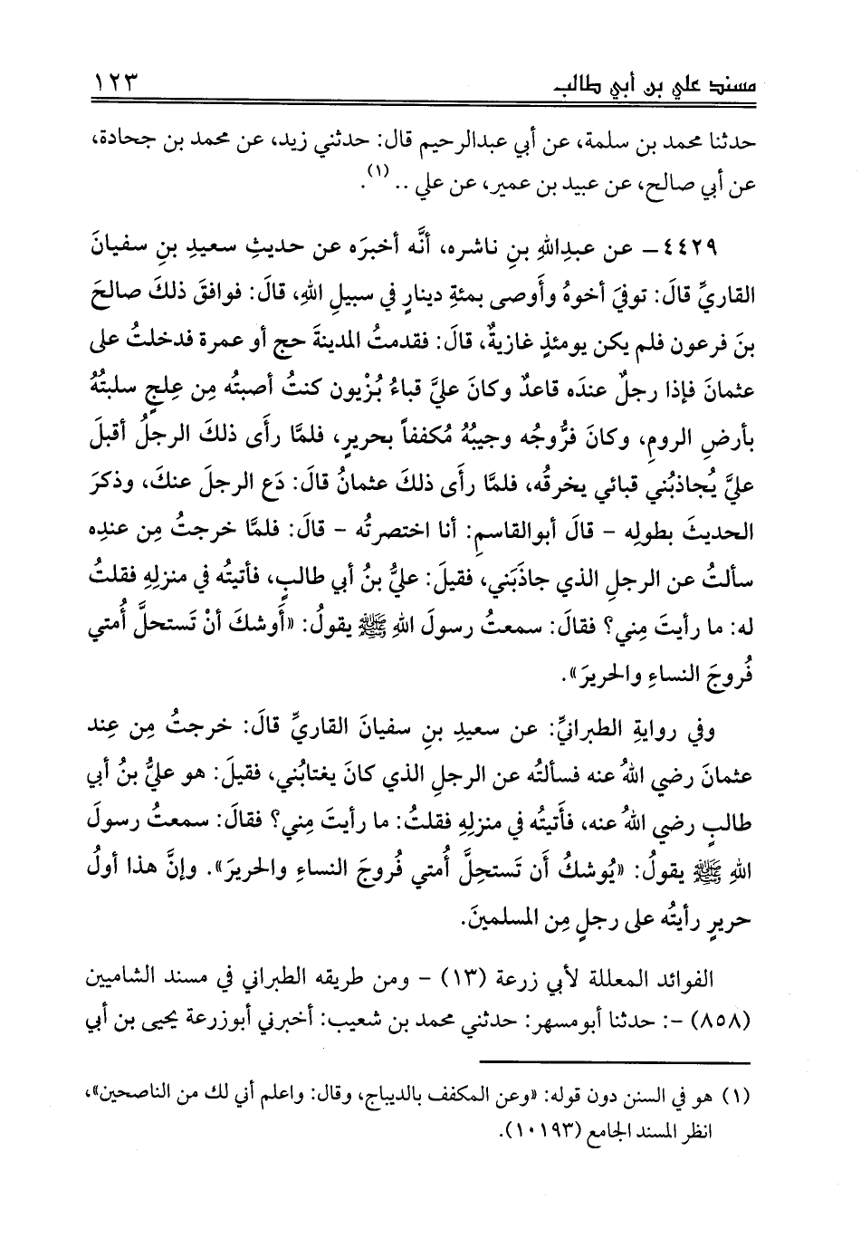 4429 - عن عبدِاللهِ بنِ ناشره، أنَّه أخبرَه عن حديثِ سعيدِ بنِ سفيانَ القاريِّ قالَ: توفيَ أخوهُ وأَوصى بمئةِ دينارٍ في سبيلِ اللهِ، قالَ: فوافقَ ذلكَ صالحَ بنَ فرعون فلم يكن يومئذٍ غازيةٌ، قالَ: فقدمتُ المدينةَ حج أو عمرة فدخلتُ على عثمانَ فإذا رجلٌ عندَه قاعدٌ وكانَ عليَّ قباءُ بُزْيون كنتُ أصبتُه مِن عِلجٍ سلبتُهُ بأرضِ الرومِ، وكانَ فرُّوجُه وجيبُهُ مُكففاً بحريرٍ، فلمَّا رأَى ذلكَ الرجلُ أقبلَ عليَّ يُجاذبُني قبائي يخرقُه، فلمَّا رأَى ذلكَ عثمانُ قالَ: دَع الرجلَ عنكَ، وذكرَ الحديثَ بطولِه - قالَ أبوالقاسمِ: أنا اختصرتُه - قالَ: فلمَّا خرجتُ مِن عندِه سألتُ عن الرجلِ الذي جاذَبَني، فقيلَ: عليُّ بنُ أبي طالبٍ، فأتيتُه في منزلِهِ فقلتُ له: ما رأيتَ مِني؟ فقالَ: سمعتُ رسولَ اللهِ صلى الله عليه وسلم يقولُ: «أَوشكَ أنْ تَستحلَّ أُمتي فُروجَ النساءِ والحريرَ».