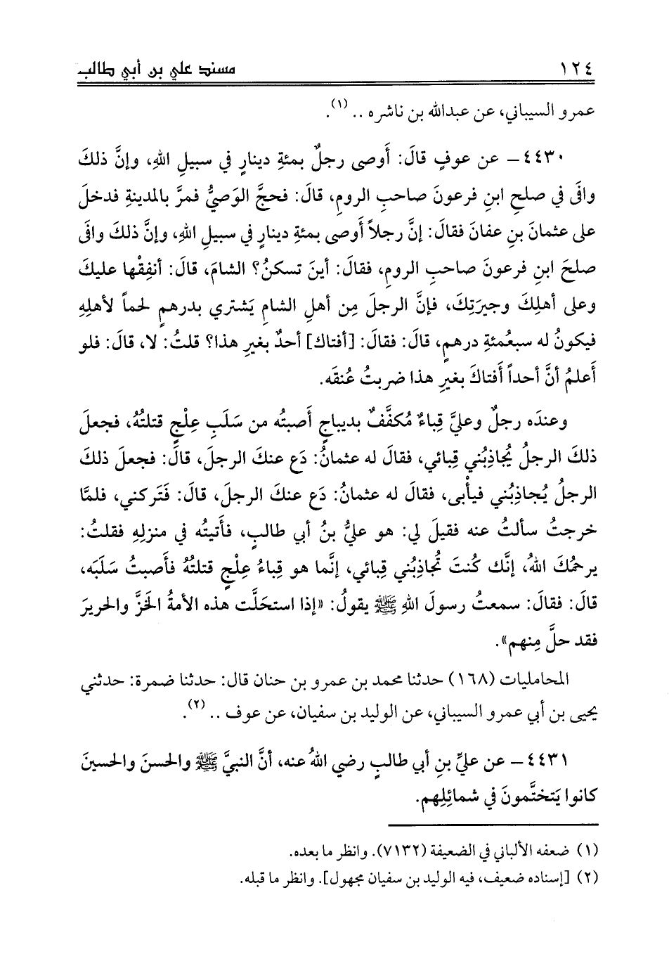 وعندَه رجلٌ وعليَّ قِباءٌ مُكفَّفٌ بديباجٍ أَصبتُه من سَلَبِ عِلْجٍ قتلتُهُ، فجعلَ ذلكَ الرجلُ يُجاذِبُني قِبائي، فقالَ له عثمانُ: دَع عنكَ الرجلَ، قالَ: فجعلَ ذلكَ الرجلُ يُجاذِبُني فيأْبى، فقالَ له عثمانُ: دَع عنكَ الرجلَ، قالَ: فَتَركني، فلمَّا خرجتُ سألتُ عنه فقيلَ لي: هو عليُّ بنُ أبي طالبٍ، فأَتيتُه في منزلِهِ فقلتُ: يرحمُكَ اللهُ، إنَّك كُنتَ تُجاذِبُني قِبائي، إنَّما هو قِباءُ عِلْجٍ قتلتُهُ فأَصبتُ سَلَبَه، قالَ: فقالَ: سمعتُ رسولَ اللهِ صلى الله عليه وسلم يقولُ: «إذا استحَلَّت هذه الأمةُ الخَزَّ والحريرَ فقد حلَّ مِنهم».