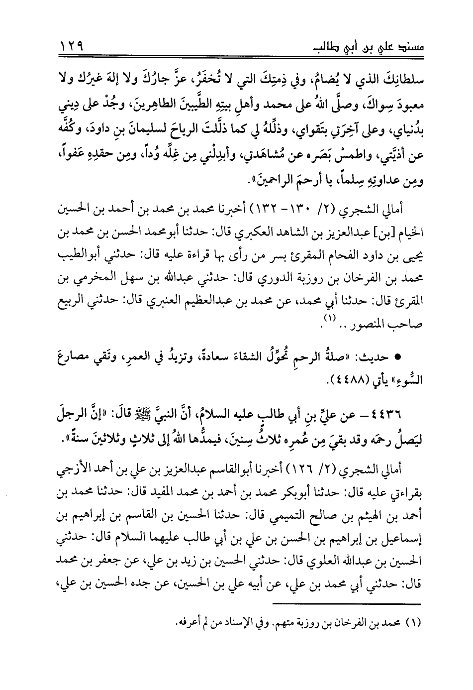 4436 - عن عليِّ بنِ أبي طالبٍ عليه السلامُ، أنَّ النبيَّ صلى الله عليه وسلم قالَ: «إنَّ الرجلَ ليَصلُ رحمَه وقد بقيَ مِن عُمرِه ثلاثُ سِنينَ، فيمدُّها اللهُ إلى ثلاثٍ وثلاثينَ سنةً».