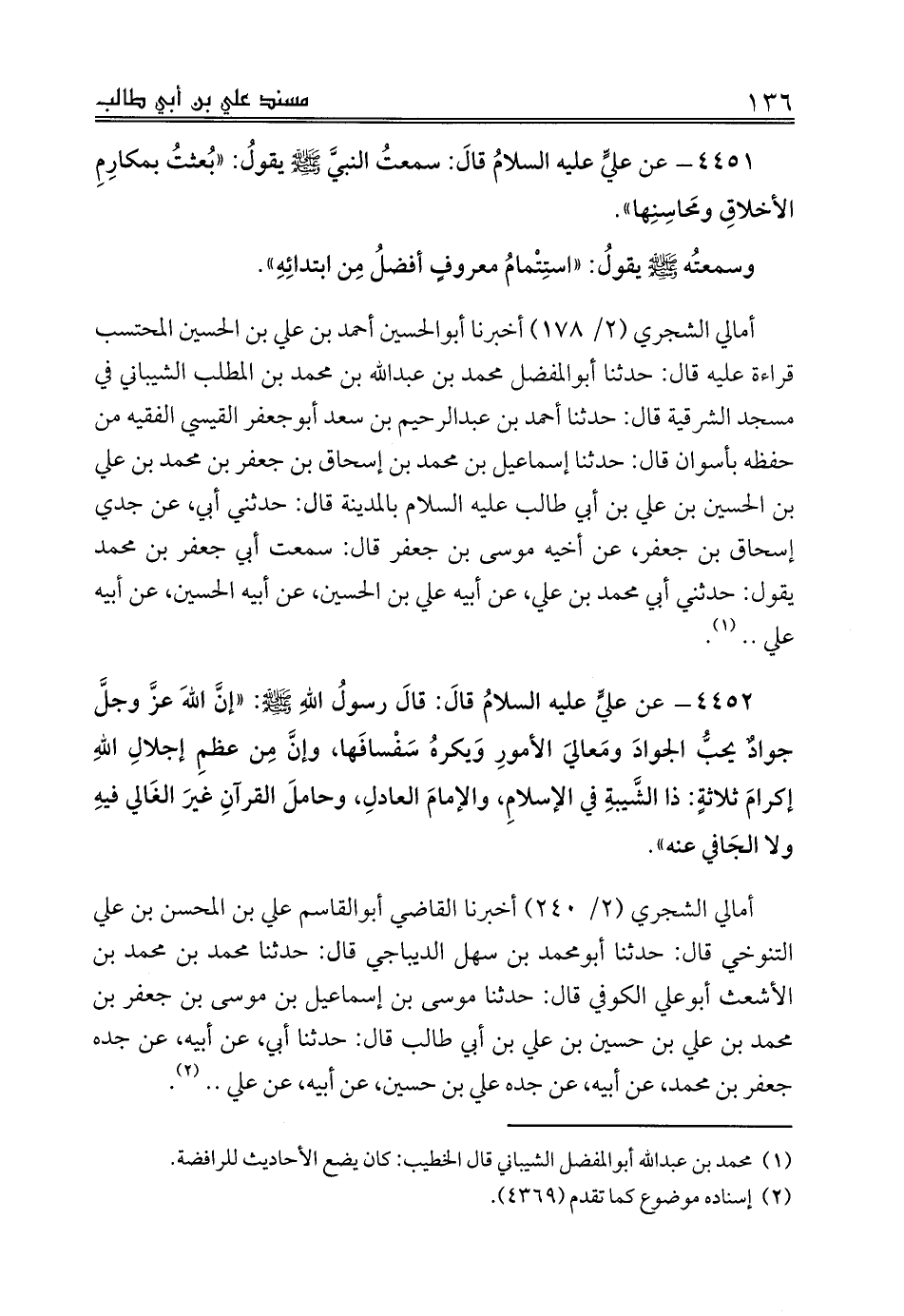 أمالي الشجري (2/ 240) أخبرنا القاضي أبوالقاسم علي بن المحسن بن علي التنوخي قال: حدثنا أبومحمد بن سهل الديباجي قال: حدثنا محمد بن محمد بن الأشعث أبوعلي الكوفي قال: حدثنا موسى بن إسماعيل بن موسى بن جعفر بن محمد بن علي بن حسين بن علي بن أبي طالب قال: حدثنا أبي، عن أبيه، عن جده جعفر بن محمد، عن أبيه، عن جده علي بن حسين، عن أبيه، عن علي .. (¬2).