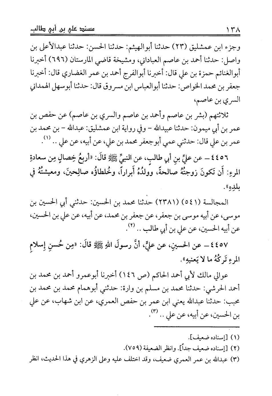 4457 - عن الحسينِ، عن عليٍّ، أنَّ رسولَ اللهِ صلى الله عليه وسلم قالَ: «مِن حُسنِ إِسلامِ المرءِ تَركُهُ ما لا يَعنيهِ».