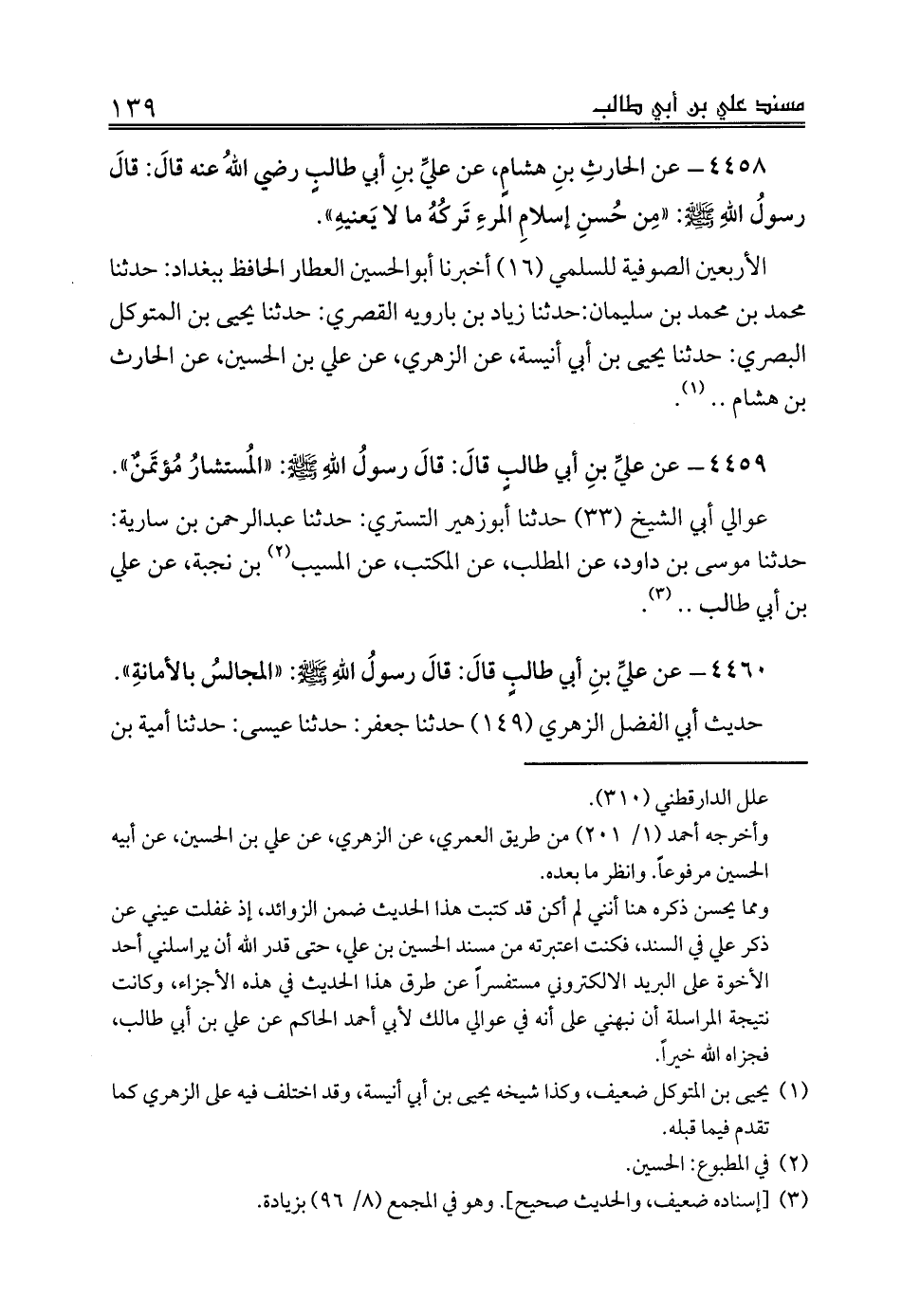 4458 - عن الحارثِ بنِ هشامٍ، عن عليِّ بنِ أبي طالبٍ رضي اللهُ عنه قالَ: قالَ رسولُ اللهِ صلى الله عليه وسلم: «مِن حُسنِ إسلامِ المرءِ تَركُهُ ما لا يَعنيهِ».