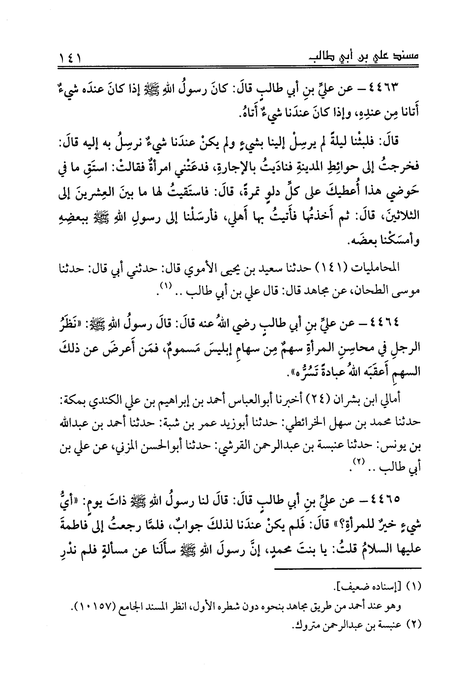أمالي ابن بشران (24) أخبرنا أبوالعباس أحمد بن إبراهيم بن علي الكندي بمكة: حدثنا محمد بن سهل الخرائطي: حدثنا أبوزيد عمر بن شبة: حدثنا أحمد بن عبدالله بن يونس: حدثنا عنبسة بن عبدالرحمن القرشي: حدثنا أبوالحسن المزني، عن علي بن أبي طالب .. (¬2).