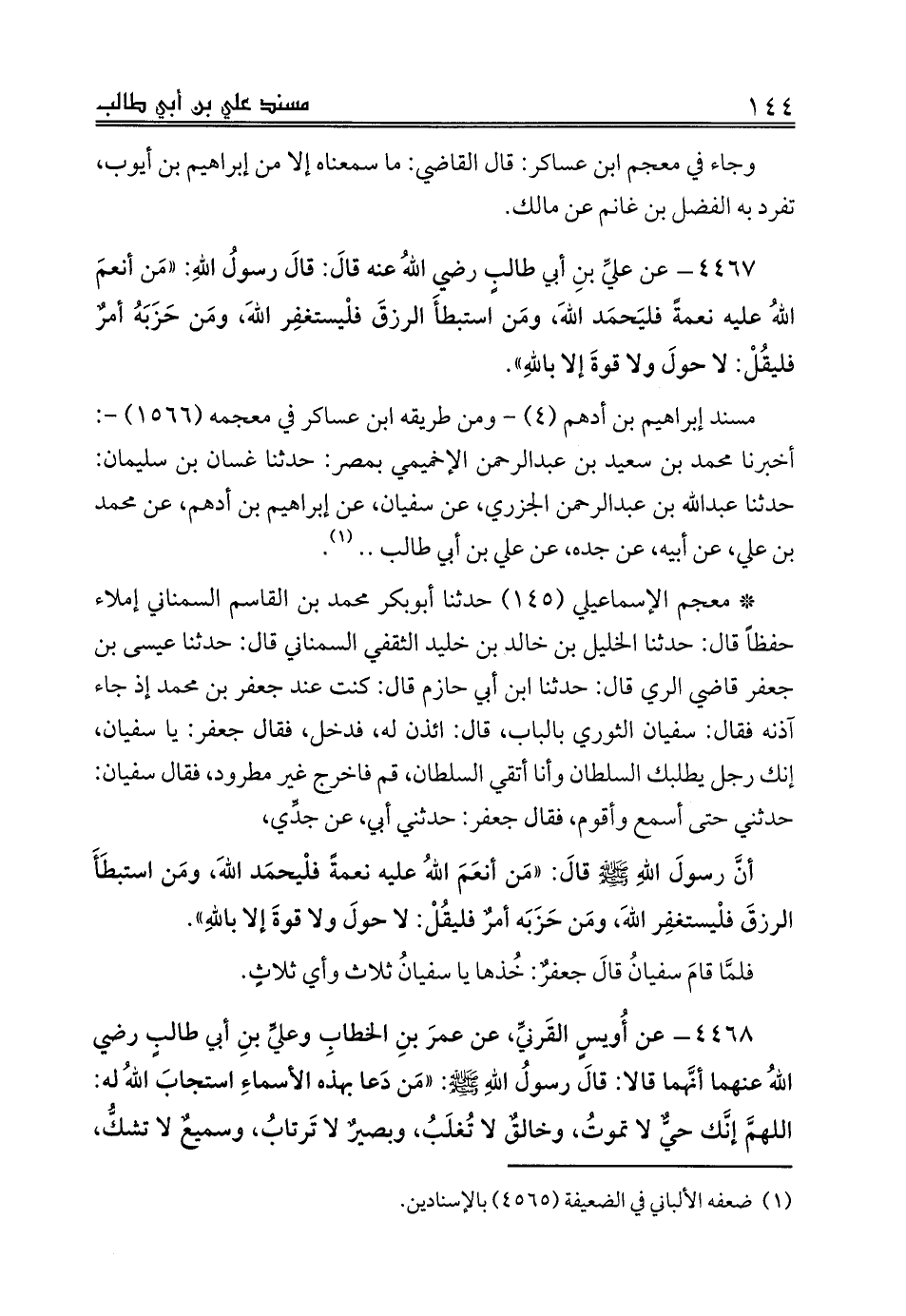 مسند إبراهيم بن أدهم (4) - ومن طريقه ابن عساكر في معجمه (1566) -: أخبرنا محمد بن سعيد بن عبدالرحمن الإخميمي بمصر: حدثنا غسان بن سليمان: حدثنا عبدالله بن عبدالرحمن الجزري، عن سفيان، عن إبراهيم بن أدهم، عن محمد بن علي، عن أبيه، عن جده، عن علي بن أبي طالب .. (¬1).