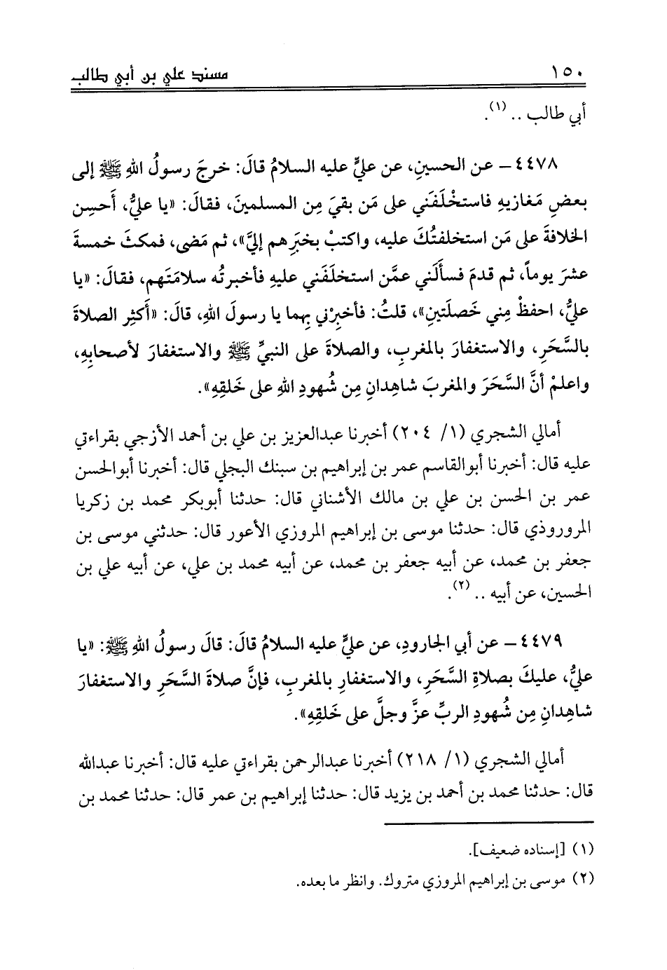 4479 - عن أبي الجارودِ، عن عليٍّ عليه السلامُ قالَ: قالَ رسولُ اللهِ صلى الله عليه وسلم: «يا عليُّ، عليكَ بصلاةِ السَّحَرِ، والاستغفارِ بالمغربِ، فإنَّ صلاةَ السَّحَرِ والاستغفارَ شاهِدانِ مِن شُهودِ الربِّ عزَّ وجلَّ على خَلقِهِ».