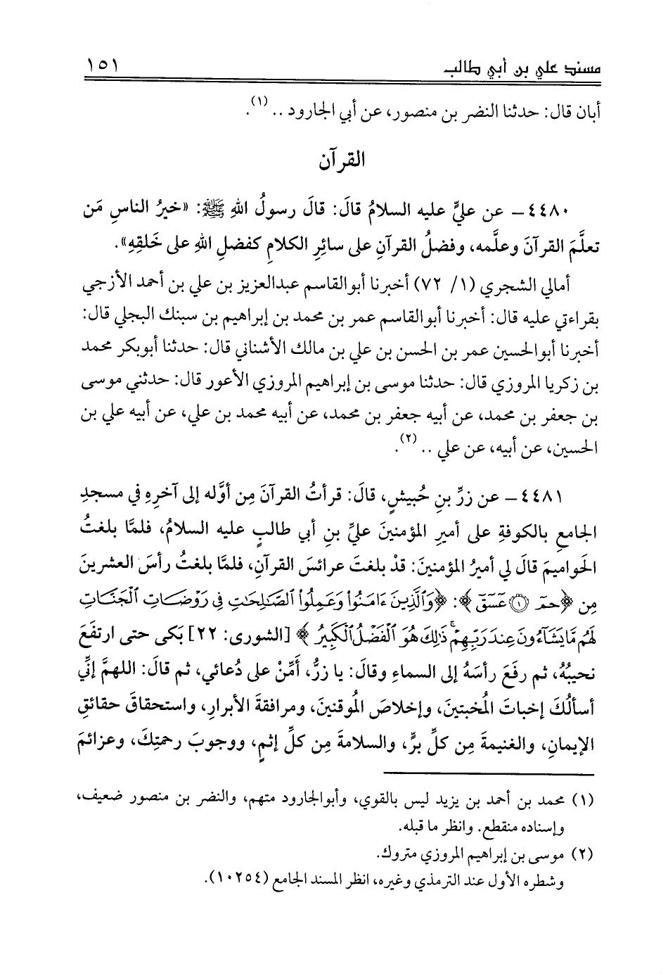 4481 - عن زرِّ بنِ حُبيشٍ، قالَ: قرأتُ القرآنَ مِن أوَّله إلى آخرِهِ في مسجدِ الجامعِ بالكوفةِ على أميرِ المؤمنينَ عليِّ بنِ أبي طالبٍ عليه السلامُ، فلمَّا بلغتُ الحَواميمَ قالَ لي أميرُ المؤمنينَ: قدْ بلغتَ عرائسَ القرآنِ، فلمَّا بلغتُ رأسَ العشرينَ مِن {حم (1) عسق}: {وَالَّذِينَ آمَنُوا وَعَمِلُوا الصَّالِحَاتِ فِي رَوْضَاتِ الْجَنَّاتِ لَهُمْ مَا يَشَاءُونَ عِنْدَ رَبِّهِمْ ذَلِكَ هُوَ الْفَضْلُ الْكَبِيرُ} [الشورى: 22] بَكى حتى ارتفَعَ نحيبُهُ، ثم رفَعَ رأسَهُ إلى السماءِ وقالَ: يا زرُّ، أَمِّنْ على دُعائي، ثم قالَ: اللهمَّ إنِّي أسألُكَ إخباتَ المُخبتينَ، وإخلاصَ المُوقنينَ، ومرافقةَ الأبرارِ، واستحقاقَ حقائقِ الإيمانِ، والغنيمةَ مِن كلِّ برٍّ، والسلامةَ مِن كلِّ إثمٍ، ووجوبَ رحمتِكَ، وعزائمَ