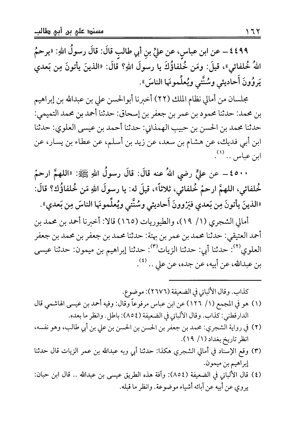 4499 - عن ابن عباسٍ، عن عليِّ بنِ أبي طالبٍ قالَ: قالَ رسولُ اللهِ: «يرحمُ اللهُ خُلفائي»، قيلَ: ومَن خُلفاؤُكَ يا رسولَ اللهِ؟ قالَ: «الذينَ يأتونَ مِن بَعدي يَروُونَ أَحاديثي وسُنَّتي ويُعلِّمونَها الناسَ».