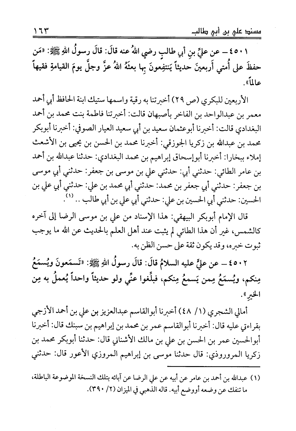 الأربعين للبكري (ص 29) أخبرتنا به رقية واسمها ستيك ابنة الحافظ أبي أحمد معمر بن عبدالواحد بن الفاخر بأصبهان قالت: أخبرتنا فاطمة بنت محمد بن أحمد البغدادي قالت: أخبرنا أبوعثمان سعيد بن أبي سعيد العيار الصوفي: أخبرنا أبوبكر محمد بن عبدالله بن زكريا الجوزقي: أخبرنا محمد بن الحسن بن يحيى بن الأشعث إملاء ببخارا: أخبرنا أبوإسحاق إبراهيم بن محمد البغدادي: حدثنا عبدالله أحمد بن عامر الطائي: حدثني أبي: حدثني علي بن موسى بن جعفر: حدثني أبي موسى بن جعفر: حدثني أبي جعفر بن محمد: حدثني أبي محمد بن علي: حدثني أبي علي بن الحسين: حدثني أبي الحسين بن علي: حدثني أبي علي بن أبي طالب .. (¬1).