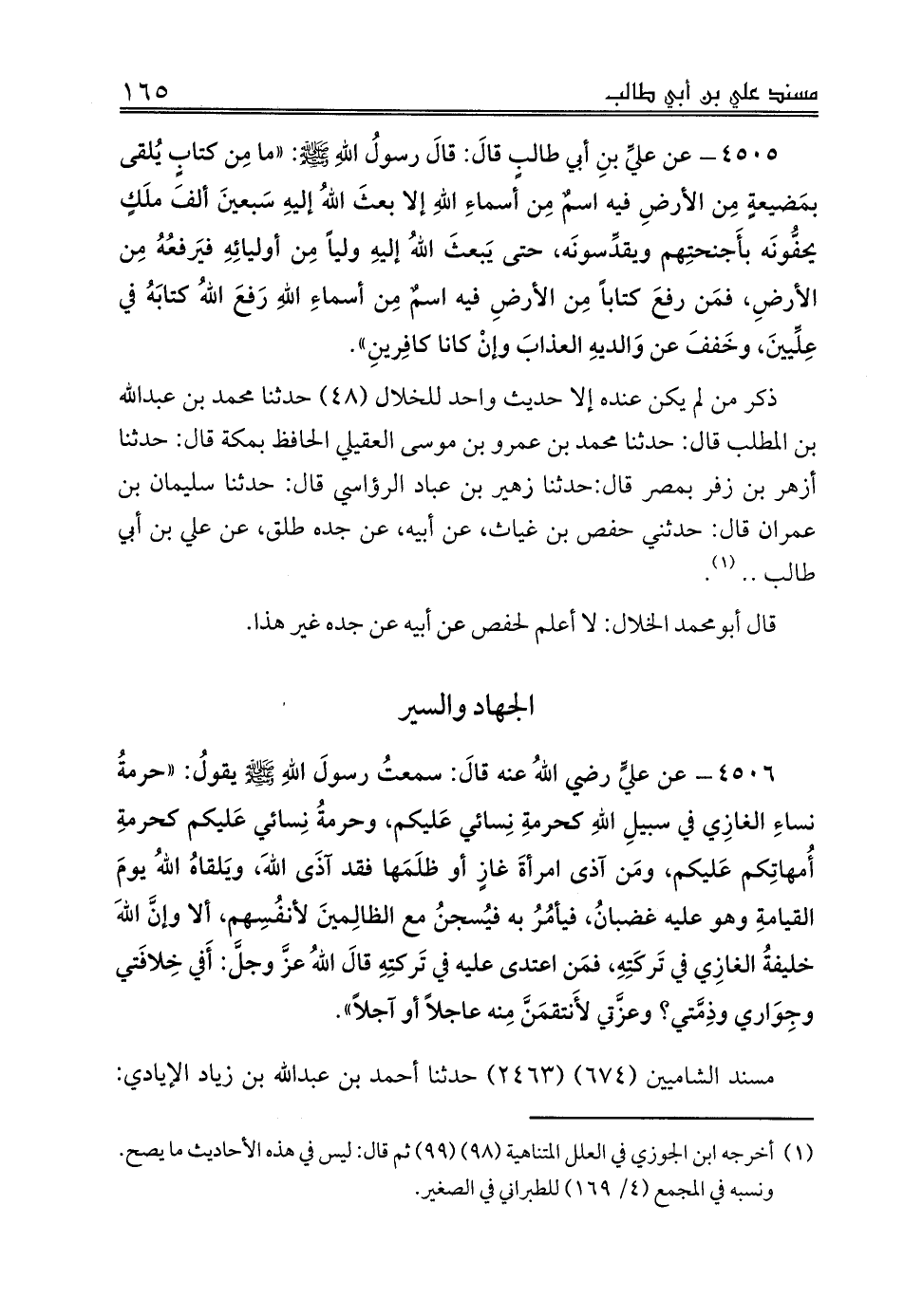 ذكر من لم يكن عنده إلا حديث واحد للخلال (48) حدثنا محمد بن عبدالله بن المطلب قال: حدثنا محمد بن عمرو بن موسى العقيلي الحافظ بمكة قال: حدثنا أزهر بن زفر بمصر قال: حدثنا زهير بن عباد الرؤاسي قال: حدثنا سليمان بن عمران قال: حدثني حفص بن غياث، عن أبيه، عن جده طلق، عن علي بن أبي طالب .. (¬1).