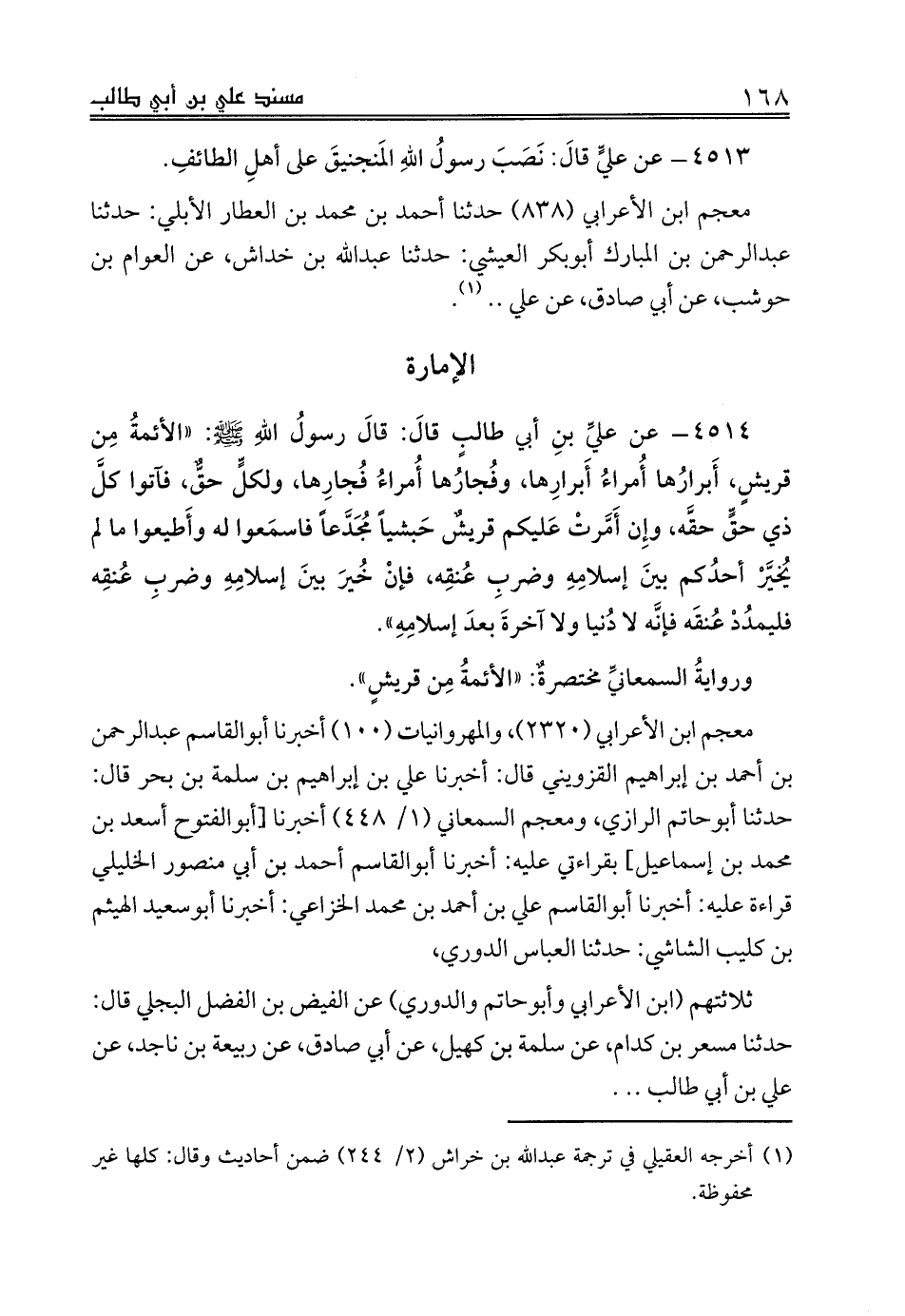 معجم ابن الأعرابي (838) حدثنا أحمد بن محمد بن العطار الأبلي: حدثنا عبدالرحمن بن المبارك أبوبكر العيشي: حدثنا عبدالله بن خداش، عن العوام بن حوشب، عن أبي صادق، عن علي .. (¬1).