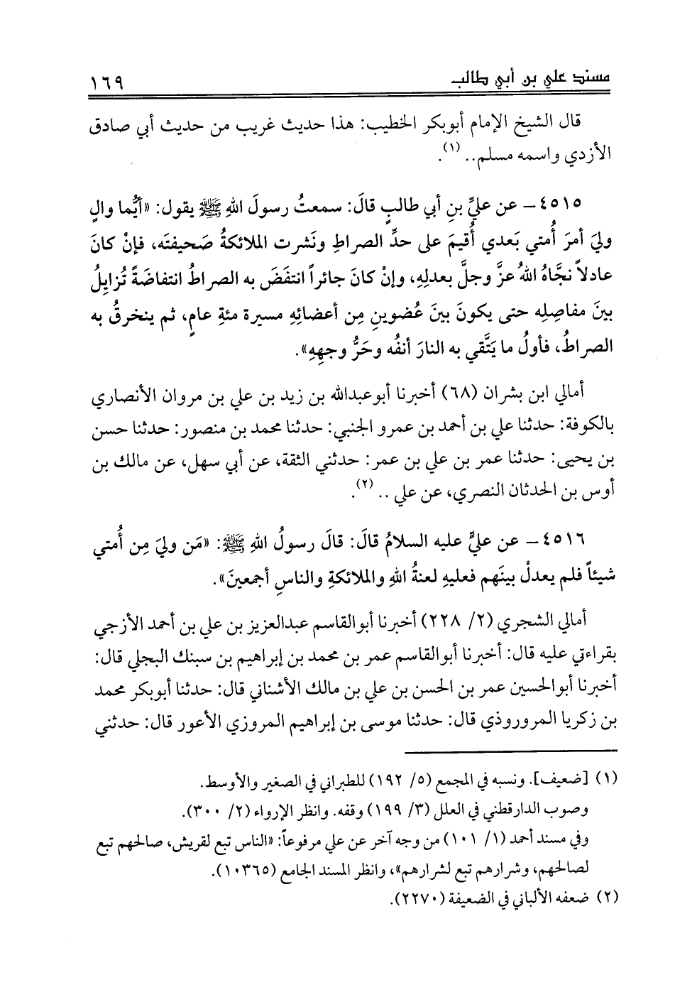 4515 - عن عليِّ بنِ أبي طالبٍ قالَ: سمعتُ رسولَ اللهِ صلى الله عليه وسلم يقول: «أيُّما والٍ وليَ أمرَ أُمتي بَعدي أُقيمَ على حدِّ الصراطِ ونَشرت الملائكةُ صَحيفتَه، فإنْ كانَ عادلاً نجَّاهُ اللهُ عزَّ وجلَّ بعدلِهِ، وإنْ كانَ جائراً انتفَضَ به الصراطُ انتفاضَةً تُزايِلُ بينَ مفاصِلِه حتى يكونَ بينَ عُضوينِ مِن أعضائِهِ مسيرة مئةِ عامٍ، ثم ينخرقُ به الصراطُ، فأولُ ما يَتَّقي به النارَ أنفُه وحَرُّ وجهِهِ».