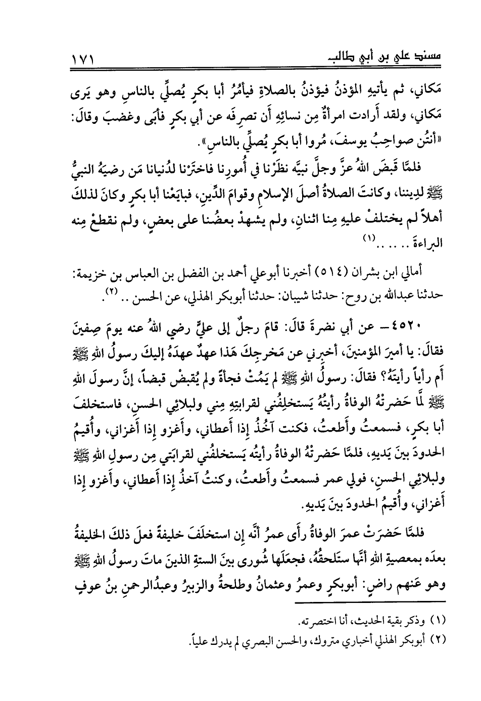 4520 - عن أبي نضرةَ قالَ: قامَ رجلٌ إلى عليٍّ رضي اللهُ عنه يومَ صِفينَ فقالَ: يا أميرَ المؤمنينَ، أخبِرني عن مَخرجِكَ هَذا عهدٌ عهدَهُ إليكَ رسولُ اللهِ صلى الله عليه وسلم أَم رأياً رأيتَهُ؟ فقالَ: رسولُ اللهِ صلى الله عليه وسلم لم يَمُتْ فجأةً ولم يُقبضْ قبضاً، إنَّ رسولَ اللهِ صلى الله عليه وسلم لمَّا حَضرتْهُ الوفاةُ رأيتُهُ يَستخلِفُني لقرابتِهِ مِني ولبلائِي الحسنُ، فاستخلفَ أبا بكرٍ، فسمعتُ وأَطعتُ، فكنت آخُذُ إِذا أَعطاني، وأَغزوا إِذا أَغزاني، وأُقيمُ الحدودَ بينَ يَديهِ، فلمَّا حَضرتْهُ الوفاةُ رأيتُه يَستخلفُني لقرابَتي مِن رسولِ اللهِ صلى الله عليه وسلم ولبلائِي الحسنِ، فولي عمر فسمعتُ وأَطعتُ، وكنتُ آخذُ إِذا أَعطاني، وأَغزو إِذا أَغزاني، وأُقيمُ الحدودَ بينَ يَديهِ.