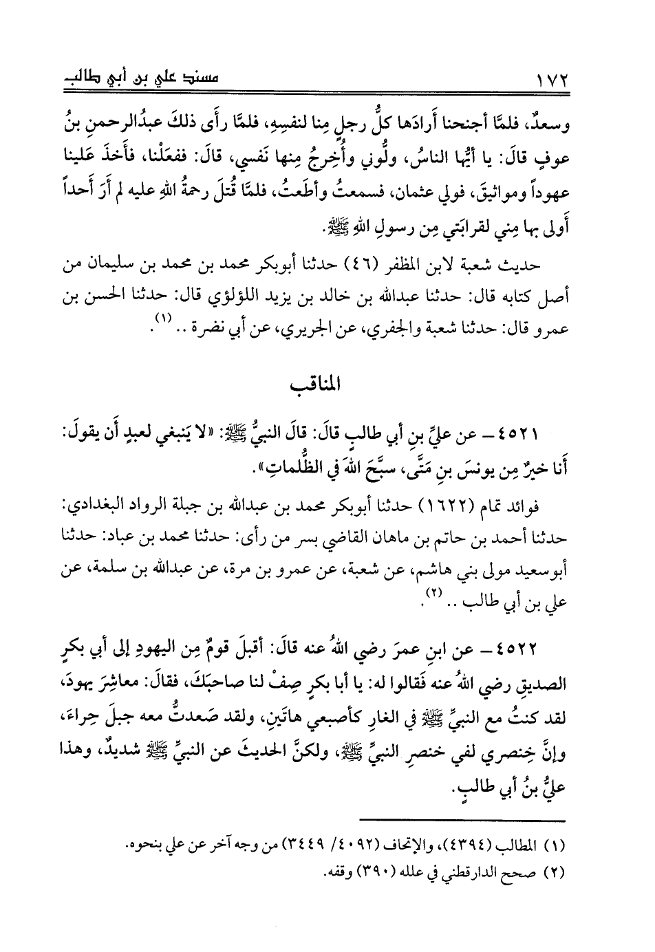 4521 - عن عليِّ بنِ أبي طالبٍ قالَ: قالَ النبيُّ صلى الله عليه وسلم: «لا يَنبغي لعبدٍ أَن يقولَ: أَنا خيرٌ مِن يونسَ بنِ مَتَّى، سبَّحَ اللهَ في الظُّلماتِ».