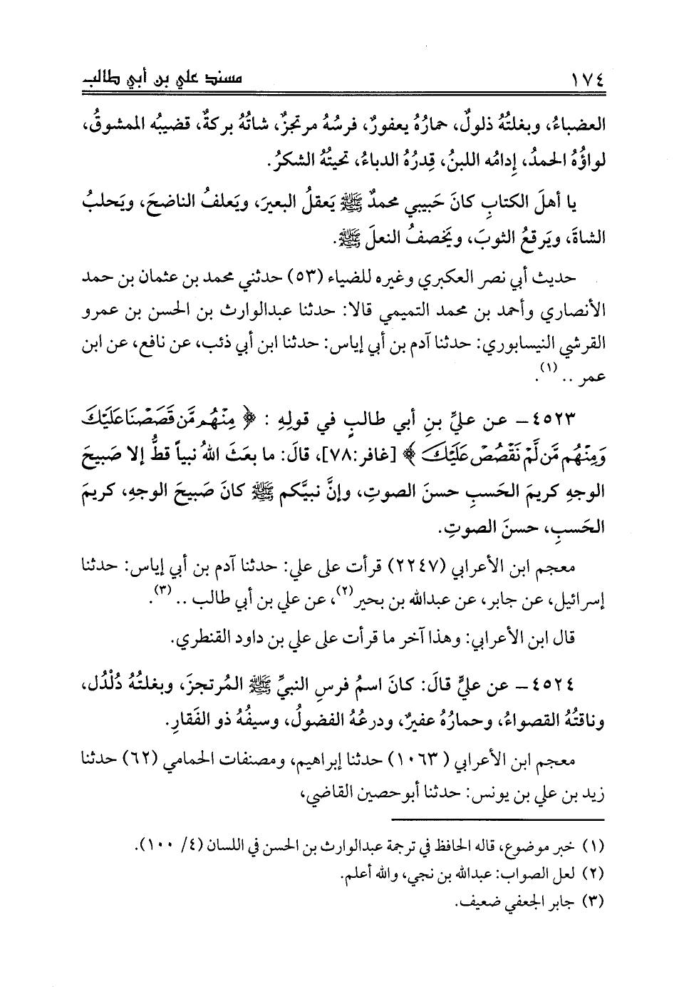 معجم ابن الأعرابي (2247) قرأت على علي: حدثنا آدم بن أبي إياس: حدثنا إسرائيل، عن جابر، عن عبدالله بن بحير (¬2)، عن علي بن أبي طالب .. (¬3).