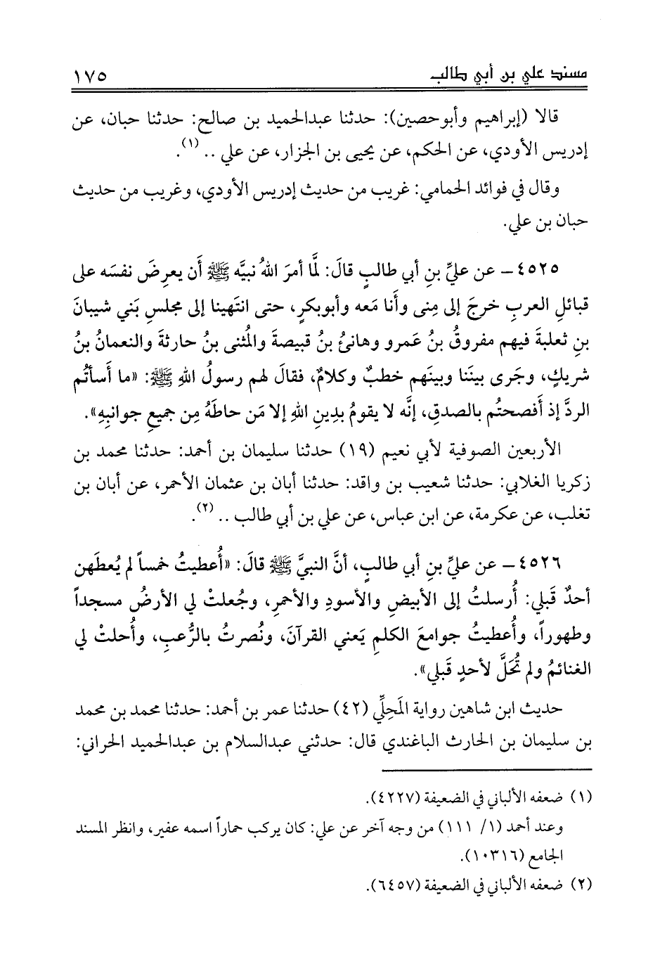 4525 - عن عليِّ بنِ أبي طالبٍ قالَ: لمَّا أمرَ اللهُ نبيَّه صلى الله عليه وسلم أَن يعرِضَ نفسَه على قبائلِ العربِ خرجَ إلى مِنى وأَنا مَعه وأبوبكرٍ، حتى انتَهينا إلى مجلسِ بَني شيبانَ بنِ ثعلبةَ فيهم مفروقُ بنُ عَمرو وهانئُ بنُ قبيصةَ والمُثنى بنُ حارثةَ والنعمانُ بنُ شريكٍ، وجَرى بينَنا وبينَهم خطبٌ وكلامٌ، فقالَ لهم رسولُ اللهِ صلى الله عليه وسلم: «ما أَسأتُم الردَّ إذ أَفصحتُم بالصدقِ، إنَّه لا يقومُ بدِينِ اللهِ إلا مَن حاطَهُ مِن جميعِ جوانبِهِ».