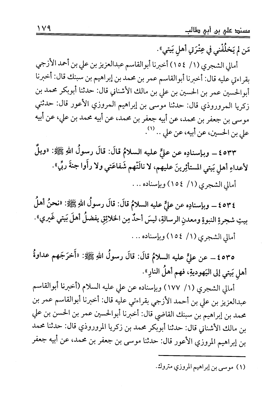 أمالي الشجري (1/ 154) أخبرنا أبوالقاسم عبدالعزيز بن علي بن أحمد الأزجي بقراءتي عليه قال: أخبرنا أبوالقاسم عمر بن محمد بن إبراهيم بن سبنك قال: أخبرنا أبوالحسين عمر بن الحسين بن علي بن مالك الأشناني قال: حدثنا أبوبكر محمد بن زكريا المروروذي قال: حدثنا موسى بن إبراهيم المروزي الأعور قال: حدثني موسى بن جعفر بن محمد، عن أبيه جعفر بن محمد، عن أبيه محمد بن علي، عن أبيه علي بن الحسين، عن أبيه، عن علي .. (¬1).