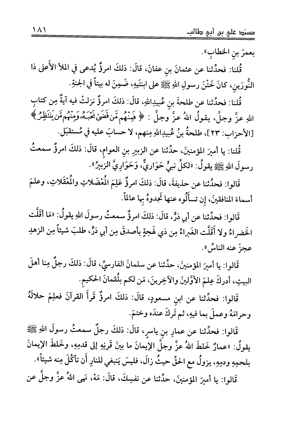 قَالوا: فحدِّثنا عن عمارِ بنِ ياسرٍ، قالَ: ذلكَ رجلٌ سمعتُ رسولَ اللهِ صلى الله عليه وسلم يقولُ: «عمارٌ خَلطَ اللهُ عزَّ وجلَّ الإيمانَ ما بينَ قَرنِهِ إلى قدمِهِ، وخَلطَ الإيمانَ بلحمِهِ ودمِهِ، يزولُ مع الحقِّ حيثُ زالَ، فليسَ يَنبغي للنارِ أَن تأكُلَ مِنه شيئاً».
