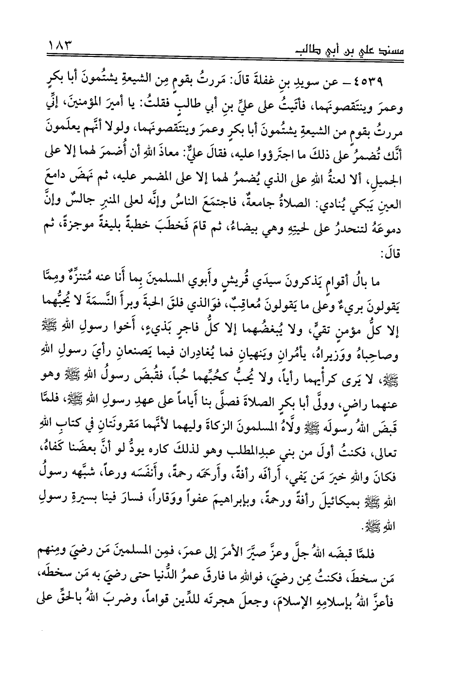 4539 - عن سويدِ بنِ غفلةَ قالَ: مَررتُ بقومٍ مِن الشيعةِ يشتُمونَ أبا بكرٍ وعمرَ وينتَقصونَهما، فأتَيتُ على عليِّ بنِ أبي طالبٍ فقلتُ: يا أميرَ المؤمنينَ، إنِّي مررتُ بقومٍ من الشيعةِ يشتُمونَ أبا بكرٍ وعمرَ وينتَقصونَهما، ولولا أنَّهم يعلَمونَ أنَّك تُضمرُ على ذلكَ ما اجتَرؤوا عليه، فقالَ عليٌّ: معاذَ اللهِ أن أُضمرَ لهما إلا على الجميلِ، ألا لعنةُ اللهِ على الذي يُضمرُ لهما إلا على المضمر عليه، ثم نَهضَ دامعَ العينِ يَبكي يُنادي: الصلاةُ جامعةٌ، فاجتمَعَ الناسُ وإنَّه لعلى المنبرِ جالسٌ وإنَّ دموعَهُ لتنحدرُ على لحيتِهِ وهي بيضاءُ، ثم قامَ فَخطَبَ خطبةً بليغةً موجزةً، ثم قالَ:
