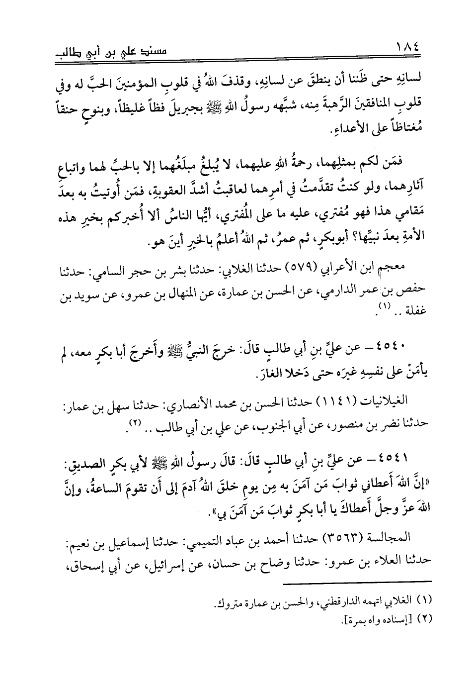 4540 - عن عليِّ بنِ أبي طالبٍ قالَ: خرجَ النبيُّ صلى الله عليه وسلم وأَخرجَ أبا بكرٍ معه، لم يأمَنْ على نفسِهِ غيرَه حتى دَخلا الغارَ.