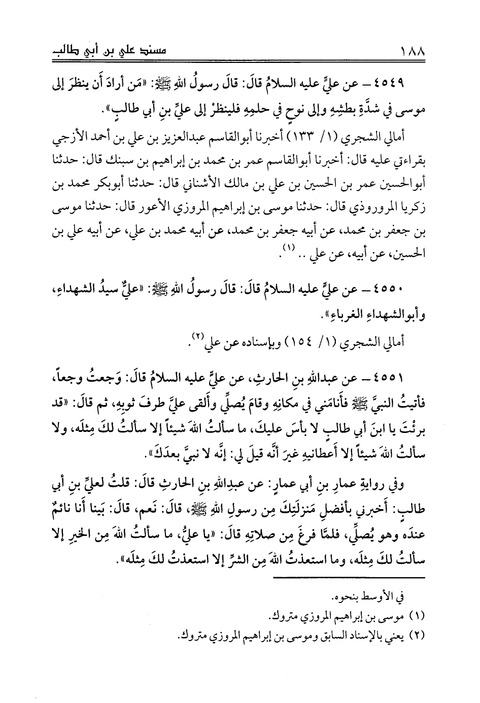 أمالي الشجري (1/ 133) أخبرنا أبوالقاسم عبدالعزيز بن علي بن أحمد الأزجي بقراءتي عليه قال: أخبرنا أبوالقاسم عمر بن محمد بن إبراهيم بن سبنك قال: حدثنا أبوالحسين عمر بن الحسين بن علي بن مالك الأشناني قال: حدثنا أبوبكر محمد بن زكريا المروروذي قال: حدثنا موسى بن إبراهيم المروزي الأعور قال: حدثنا موسى بن جعفر بن محمد، عن أبيه جعفر بن محمد، عن أبيه محمد بن علي، عن أبيه علي بن الحسين، عن أبيه، عن علي .. (¬1).