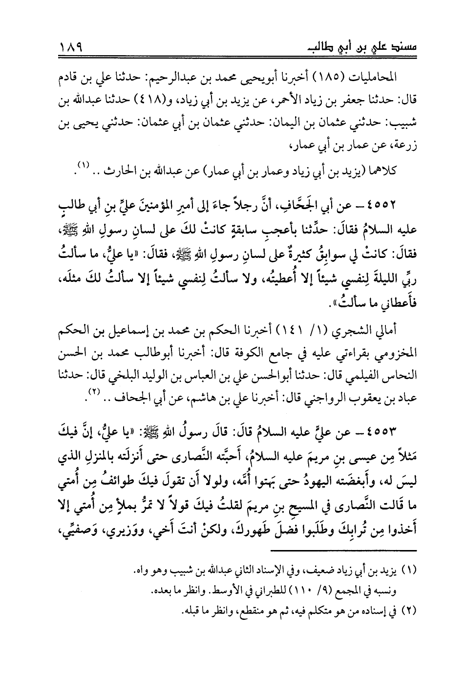 4553 - عن عليٍّ عليه السلامُ قالَ: قالَ رسولُ اللهِ صلى الله عليه وسلم: «يا عليُّ، إنَّ فيكَ مَثلاً مِن عيسى بنِ مريمَ عليه السلامُ، أَحبَّته النَّصارى حتى أَنزلَته بالمنزلِ الذي ليسَ له، وأَبغضَته اليهودُ حتى بَهتوا أُمَّه، ولولا أَن تقولَ فيكَ طوائفُ مِن أُمتي ما قَالت النَّصارى في المسيحِ بنِ مريمَ لقلتُ فيكَ قولاً لا تمرُّ بملأٍ مِن أُمتي إلا أَخذوا مِن تُرابِكَ وطَلَبوا فضلَ طَهوركَ، ولكنْ أنتَ أَخي، ووَزيري، وَصفيِّي،