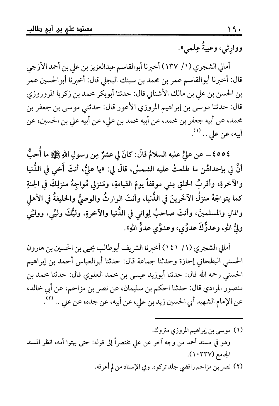 أمالي الشجري (1/ 141) أخبرنا الشريف أبوطالب يحيى بن الحسين بن هارون الحسني البطحاني إجازة وحدثنا جماعة قال: حدثنا أبوالعباس أحمد بن إبراهيم الحسني رحمه الله قال: حدثنا أبوزيد عيسى بن محمد العلوي قال: حدثنا محمد بن منصور المرادي قال: حدثنا الحكم بن سليمان، عن نصر بن مزاحم، عن أبي خالد، عن الإمام الشهيد أبي الحسين زيد بن علي، عن أبيه، عن جده، عن علي .. (¬2).