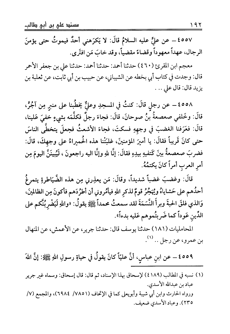 4558 - عن رجلٍ قالَ: كنتُ في المسجدِ وعليٌّ يخطُبنا على منبرٍ مِن آجُرٍّ، قالَ: وخَلفي صعصعةُ بنُ صوحانَ، قالَ: فجاءَ رجلٌ فكلَّمَه بشيءٍ خفيَ عَلينا، قالَ: فعَرَفنا الغضبَ في وجهِهِ فسكتَ، فجاءَ الأشعثُ فجعلَ يتخطَّى الناسَ حتى كانَ قَريباً فقالَ: يا أميرَ المؤمنينَ، غلبَتْنا هذه الحُميراءُ على وجهِكَ، قالَ: فضربَ صعصعةُ بينَ كَتفيهِ بيدِهِ فقالَ: إنَّا للهِ وإنَّا اليه راجعونَ، لَيُبينَنَّ اليومَ مِن أمرِ العربِ أمراً كانَ يكتمُهُ.