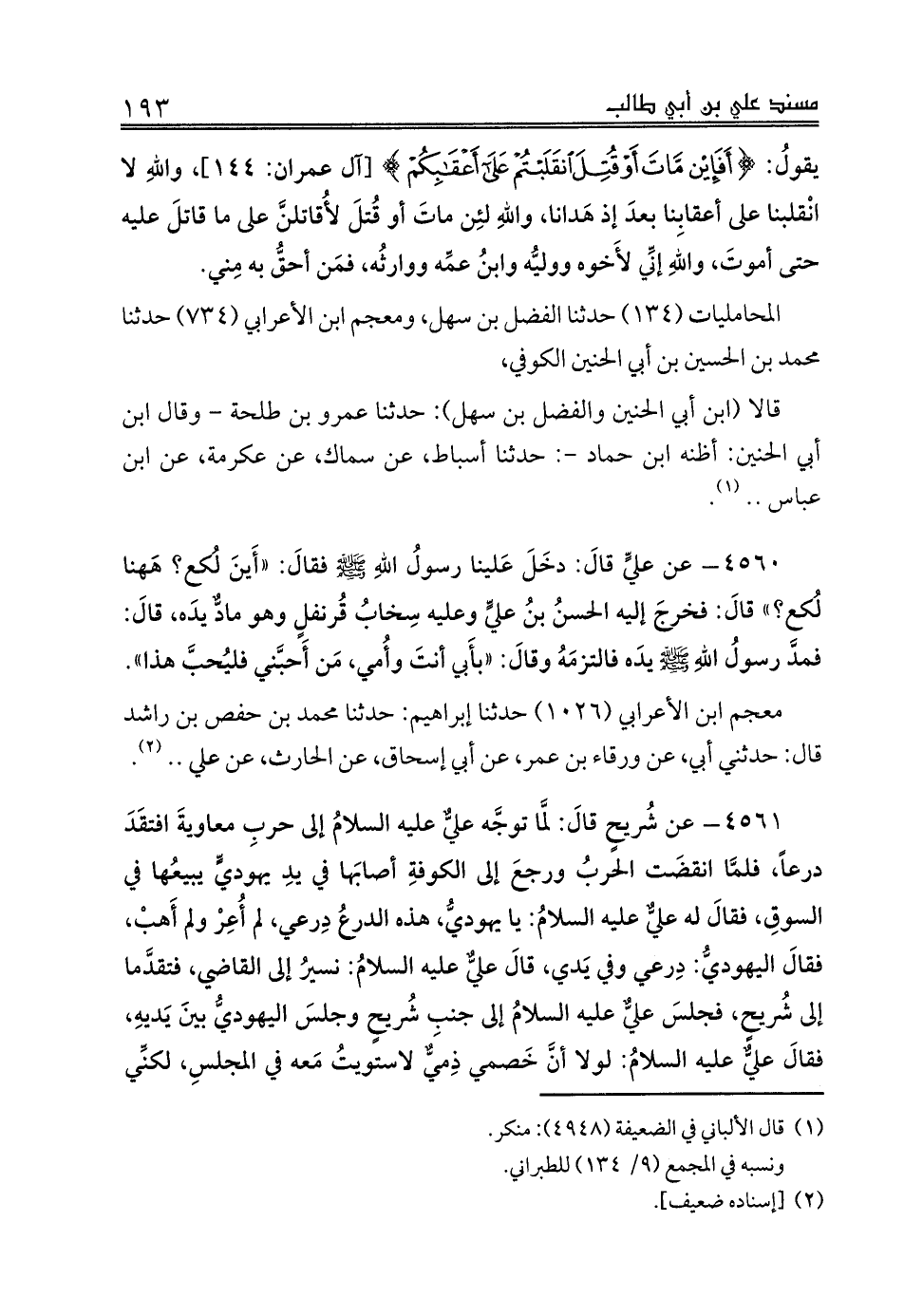 4561 - عن شُريحٍ قالَ: لمَّا توجَّه عليٌّ عليه السلامُ إلى حربِ معاويةَ افتقَدَ درعاً، فلمَّا انقضَت الحربُ ورجعَ إلى الكوفةِ أصابَها في يدِ يهوديٍّ يبيعُها في السوقِ، فقالَ له عليٌّ عليه السلامُ: يا يهوديُّ، هذه الدرعُ دِرعي، لم أُعِرْ ولم أَهبْ، فقالَ اليهوديُّ: دِرعي وفي يَدي، قالَ عليٌّ عليه السلامُ: نسيرُ إلى القاضي، فتقدَّما إلى شُريحٍ، فجلسَ عليٌّ عليه السلامُ إلى جنبِ شُريحٍ وجلسَ اليهوديُّ بينَ يَديهِ، فقالَ عليٌّ عليه السلامُ: لولا أنَّ خَصمي ذِميٌّ لاستويتُ مَعه في المجلسِ، لكنِّي