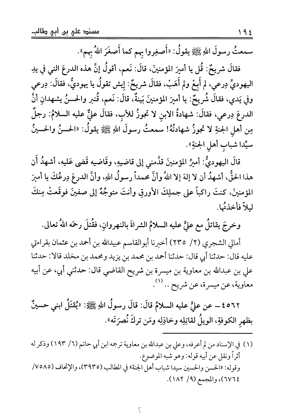 فقالَ شريحٌ: قُل يا أميرَ المؤمنينَ، قالَ: نَعم، أقولُ إنَّ هذه الدرعَ التي في يدِ اليهوديِّ دِرعي، لم أَبِعْ ولم أَهَبْ، فقالَ شريحٍ: إِيش تقولُ يا يهوديُّ، فقالَ: دِرعي وفي يَدي، فقالَ شُريحٌ: يا أميرَ المؤمنينَ بَينةٌ، قالَ: نَعم، قُنبر والحسنُ يشهدانِ أنَّ الدرعَ دِرعي، فقالَ: شهادةُ الابنِ لا تجوزُ للأبِ، فقالَ عليٌّ عليه السلامُ: رجلٌ مِن أهلِ الجنةِ لا تجوزُ شهادتُهُ! سمعتُ رسولَ اللهِ صلى الله عليه وسلم يقولُ: «الحسنُ والحسينُ سيِّدا شبابِ أهلِ الجنةِ».