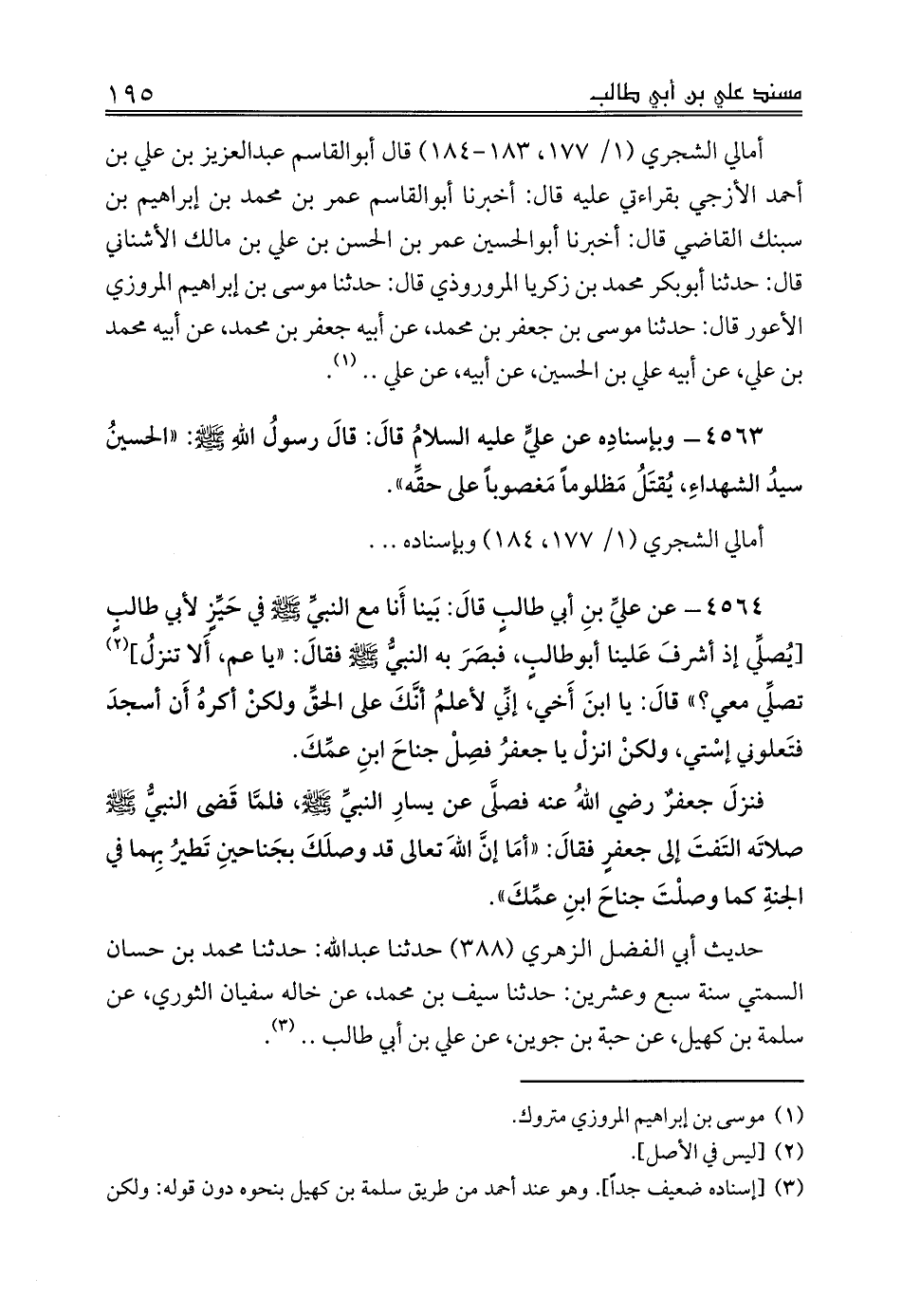 أمالي الشجري (1/ 177، 183 - 184) قال أبوالقاسم عبدالعزيز بن علي بن أحمد الأزجي بقراءتي عليه قال: أخبرنا أبوالقاسم عمر بن محمد بن إبراهيم بن سبنك القاضي قال: أخبرنا أبوالحسين عمر بن الحسن بن علي بن مالك الأشناني قال: حدثنا أبوبكر محمد بن زكريا المروروذي قال: حدثنا موسى بن إبراهيم المروزي الأعور قال: حدثنا موسى بن جعفر بن محمد، عن أبيه جعفر بن محمد، عن أبيه محمد بن علي، عن أبيه علي بن الحسين، عن أبيه، عن علي .. (¬1).