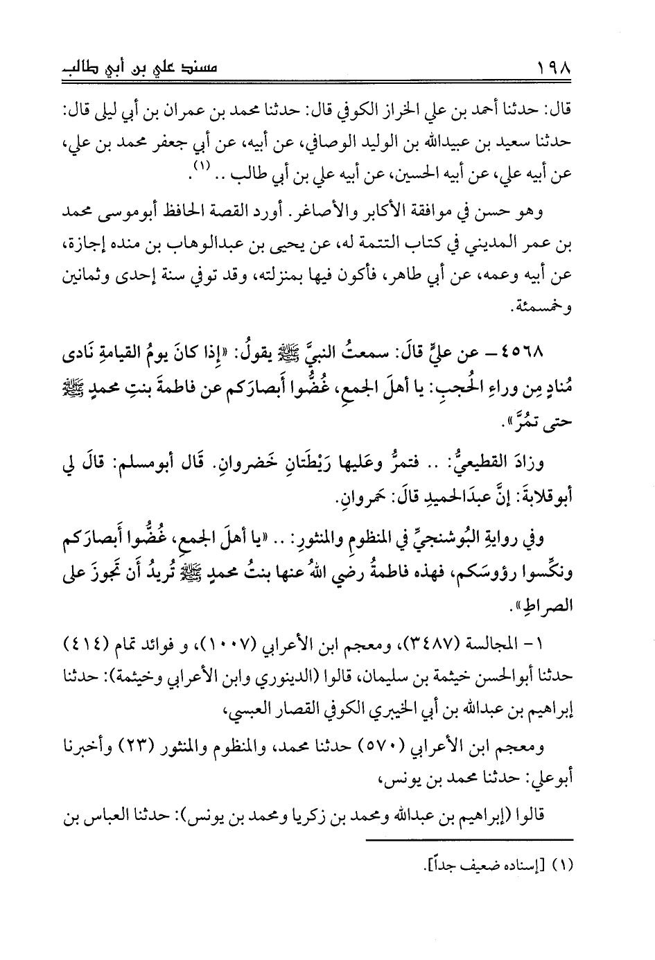 4568 - عن عليٍّ قالَ: سمعتُ النبيَّ صلى الله عليه وسلم يقولُ: «إِذا كانَ يومُ القيامةِ نَادى مُنادٍ مِن وراءِ الحُجبِ: يا أهلَ الجمعِ، غُضُّوا أَبصارَكم عن فاطمةَ بنتِ محمدٍ صلى الله عليه وسلم حتى تمُرَّ».