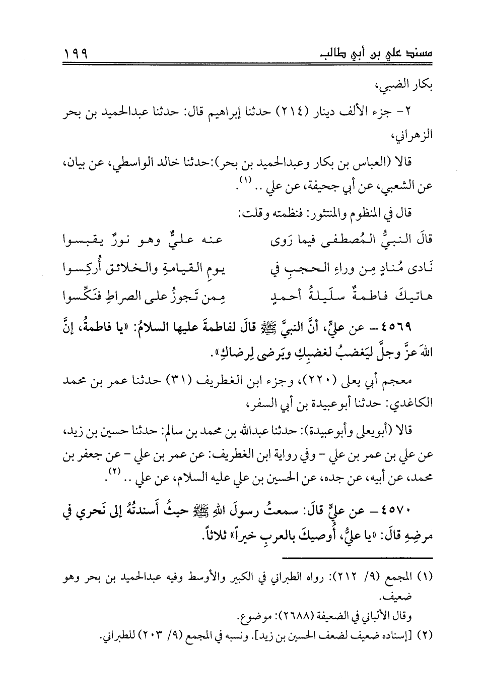 قالا (العباس بن بكار وعبدالحميد بن بحر):حدثنا خالد الواسطي، عن بيان، عن الشعبي، عن أبي جحيفة، عن علي .. (¬1).