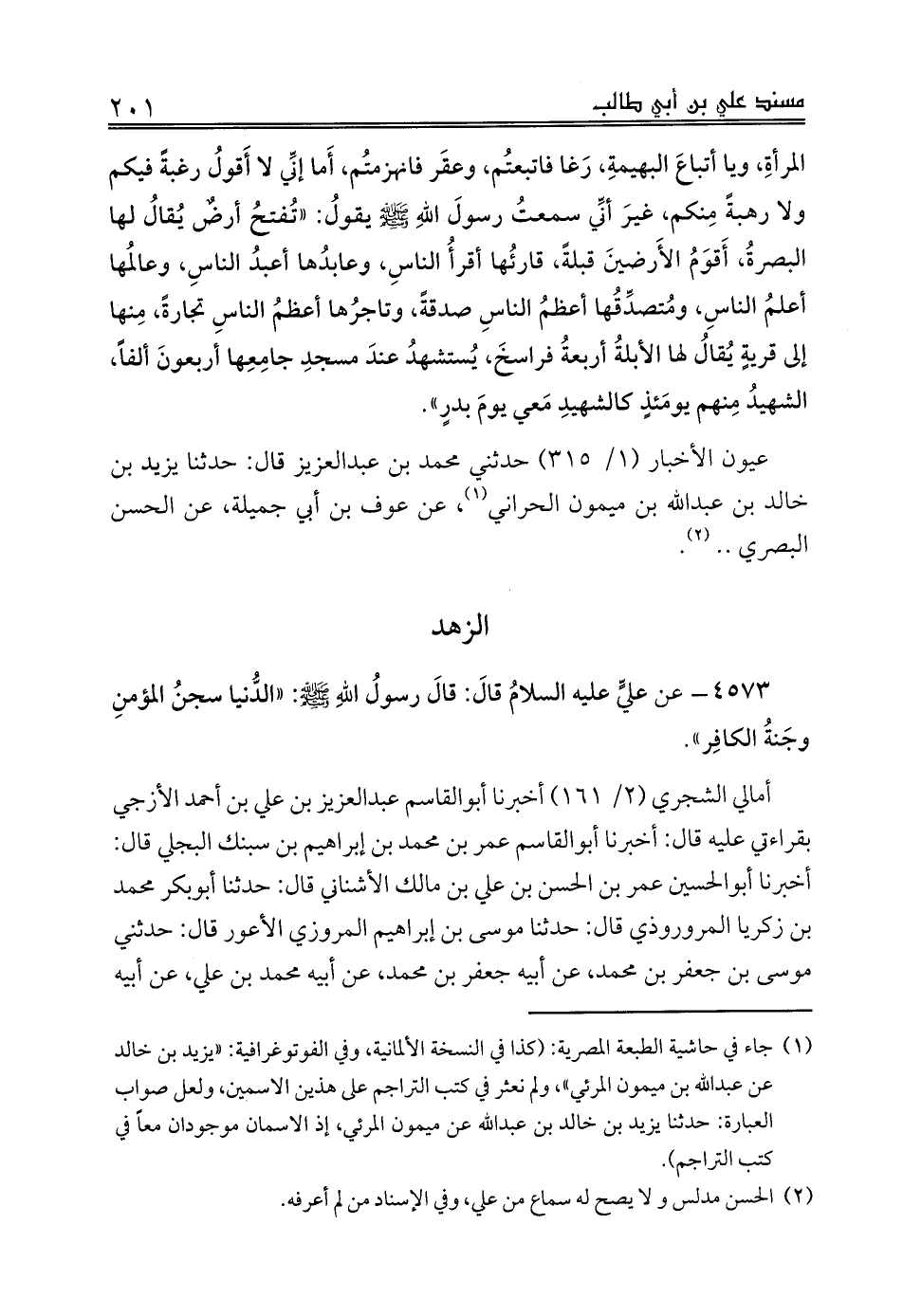 (¬1) جاء في حاشية الطبعة المصرية: (كذا في النسخة الألمانية، وفي الفوتوغرافية: «يزيد بن خالد عن عبدالله بن ميمون المرئي»، ولم نعثر في كتب التراجم على هذين الاسمين، ولعل صواب العبارة: حدثنا يزيد بن خالد بن عبدالله عن ميمون المرئي، إذ الاسمان موجودان معاً في كتب التراجم).