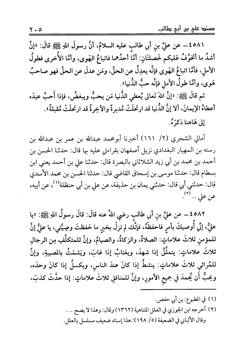 4581 - عن عليِّ بنِ أبي طالبٍ عليه السلامُ، أنَّ رسولَ اللهِ صلى الله عليه وسلم قالَ: «إنَّ أشدَّ ما أتخوَّفُ عَليكم خَصلتَانِ: أمَّا أحدُهما فاتباعُ الهَوى، وأمَّا الأُخرى فطولُ الأملِ، فأمَّا اتباعُ الهَوى فإنَّه يعدِلُ عن الحقِّ، ومَن عدلَ عن الحقِّ فهو صاحبُ هَوى، وأمَّا طولُ الأملِ فإنَّه حبُّ الدُّنيا».