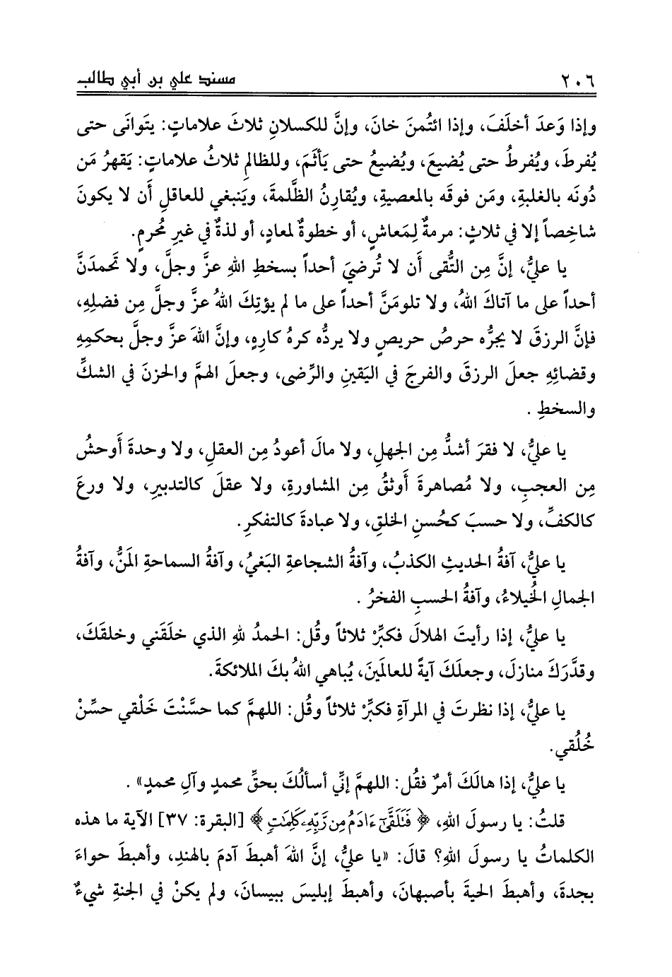يا عليُّ، لا فقرَ أشدُّ مِن الجهلِ، ولا مالَ أعودُ مِن العقلِ، ولا وحدةَ أَوحشُ مِن العجبِ، ولا مُصاهرةَ أَوثقُ مِن المشاورةِ، ولا عقلَ كالتدبيرِ، ولا ورعَ كالكفِّ، ولا حسبَ كحُسنِ الخلقِ، ولا عبادةَ كالتفكرِ.