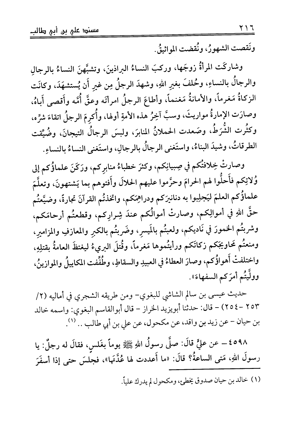 حديث عيسى بن سالم الشاشي للبغوي- ومن طريقه الشجري في أماليه (2/ 253 - 254) - قال: حدثنا أبويزيد الخراز - قال أبوالقاسم البغوي: واسمه خالد بن حيان - عن زيد بن واقد، عن مكحول، عن علي بن أبي طالب .. (¬1).